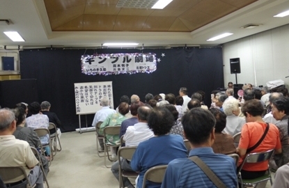 昨日の社協主宰の敬老会午後の部はキンブル一座による歌謡ショー。櫟木(いちのき)久助さん率いるキンブル一座がボランティアで楽しませてくれました。去年からお願いして今年2回目です。来年も9月9日に予約をお願いしたそうです。それではキンブル劇場開場ですオープニングは社協の皆さんも参加して赤いの着た人女性かと思ったら男性でした枚数が多いので出演順に一枚ずつ座長のいちのき久助さんです 5秒ほどで早変わり 更に早変わり 赤い服を着ていた人です 川島丈二さん 北郷トシエさん 高木悦子さん 川島丈二さん 真ん中で正座している人は櫟木さんのお孫さんです。一生懸命振り付けを覚えていました。来年は交代するのかも・・ 高木悦子さん またまた早変わりを見せてくれました 今度は大変わりです 真ん中の3人は老人会のフラダンスグループが特別参加です この女性も老人会からの特別参加です 最後は会場に居た人たちも引っ張り出してエンディング 1時間休み無しに楽しませてくれました 一座の専用車 名古屋地区では有名な安売り店キンブルの会長さんがボランティアで老人ホームの慰問や今回のようなイベントで楽しませてくれます。この櫟木久助さん名古屋のお金持ちでも有名で、何度もTV出演しています。実は私の通っている碁会所の常連さんでもあり何度も対戦している知人です。去年は前に引っ張り出され紹介されたので私も名前と顔を売ってしまいました。今回嬉しかったことが・・昼食の会場設定をしているときに・・F崎さんとおっしゃる方が声を掛けてくれました・・ブログ見ていますよ・・持って行った一眼レフを見て・・退職後に買ったカメラですね・・とだいぶ前からの読者さんでした。昼食食べながら色々お話させて戴きました。