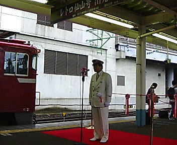 仙台からは臨時快速『レトロ仙山』号に乗りました。この快速『レトロ仙山』は随分大仰な扱いであり、仙台駅2番ホームで、出発セレモニーをやってました。画像は挨拶をしている仙台駅長さんです。