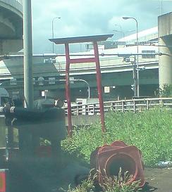 通勤途中の幹線道路の中央分離帯にある「鳥居」?車の中から撮ったのですが、まさしく「鳥居」。一つじゃないんですよね、これが幾つも中央分離帯にあるんです。場所はどこかった?。信号に近づくにつれて数が多くなってくるんです。これの意味ですか?。私の考えるところでは「立ちション禁止の鳥居」に引っ掛けて、ゴミを捨てるな!と解釈しているのですが。。。効果ですか?ん~、いまひとつかな??