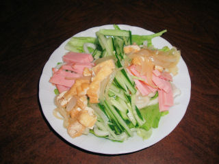 何とか体調は薬が効いたおかげでだいぶ落ち着いているものの、油断できないので自宅でゆっくり休養・・・なんですが、やはり細々とした買い物はあるわけで。恒例の掃除を済ませた後は、まず近場でお昼の材料買足しもかねて、駅前に。今日のお昼はサラダうどんにしました。まだのどの状態が今ひとつなので刺激物なし。天候不順のせいかあまり長ネギ出てないなー。仕方ないので玉葱で。きゅうりとハムそれにレタス入れてみました。うーむ錦糸玉子かミニトマト入れたほうが、もうちょっと彩りよかったか?