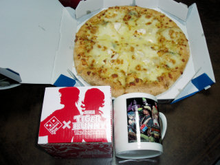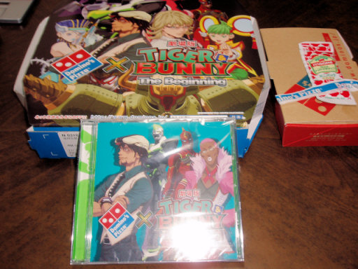 舞台版LVを堪能し、HPの方にレポートを無事に更新しました!上映前の会場内の展示や関連グッズの写真が、ちょっとした操作ミスで保存が上手くいってなかったり、残念な点もあり、少々残念無念ではありますが、少しでも雰囲気が伝われば幸いです。ところで、今週からファイヤー姐さんのスポンサーに新たに加わったドミノピザで、コラボ商品取り扱い開始となり、まあツイッターでタイバニクラスタがあらぶりすぎ!一気に3枚も注文、コラボ商品コンプ!を達成したつわものもいるようです。お仲間を招いてピザパーティだったり、一人の場合は、冷ましてから冷凍で保存し、何日かに分けて食されたりと。食べ物粗末にはしない工夫はされているようでほっとします。冷凍保存はちょっと・・・と思う人も当然私を含めていると思います。そこで週末同居の家族に協力を仰いで、ランチで注文をいたしましたよ!我が家では主に週末、月に1度程度は利用していまして、すでにネット注文常連です。ここ最近郵便受けにクーポンやメニューチラシを利用店が配布してくれていたので、ネット割引にさらにクーポン券も利用して、通常のMサイズ+コラボ商品追加値段からさらに割引であります!今回は虎徹さんバージョンのCDを頼みました!虎徹廃としてはこれだけでもGETいたしませんと!30分もしないうちに無事到着です!すべて2人できれいにいただきました!食後はばっちりCD鑑賞です!うほほほほ。楽しく拝聴しましたー!期間はまだあるので、次回はバニーのCDをと。マグカップも心惹かれますが、購入したり頂き物で家族2人だけなのに食器棚にいっぱいの為ちょっと思案中です。目覚ましも持ってるからなー。いろいろファンの心を揺さぶる公式に、ちょっと財布のひもを引き締めないとな!と思う今日この頃です。