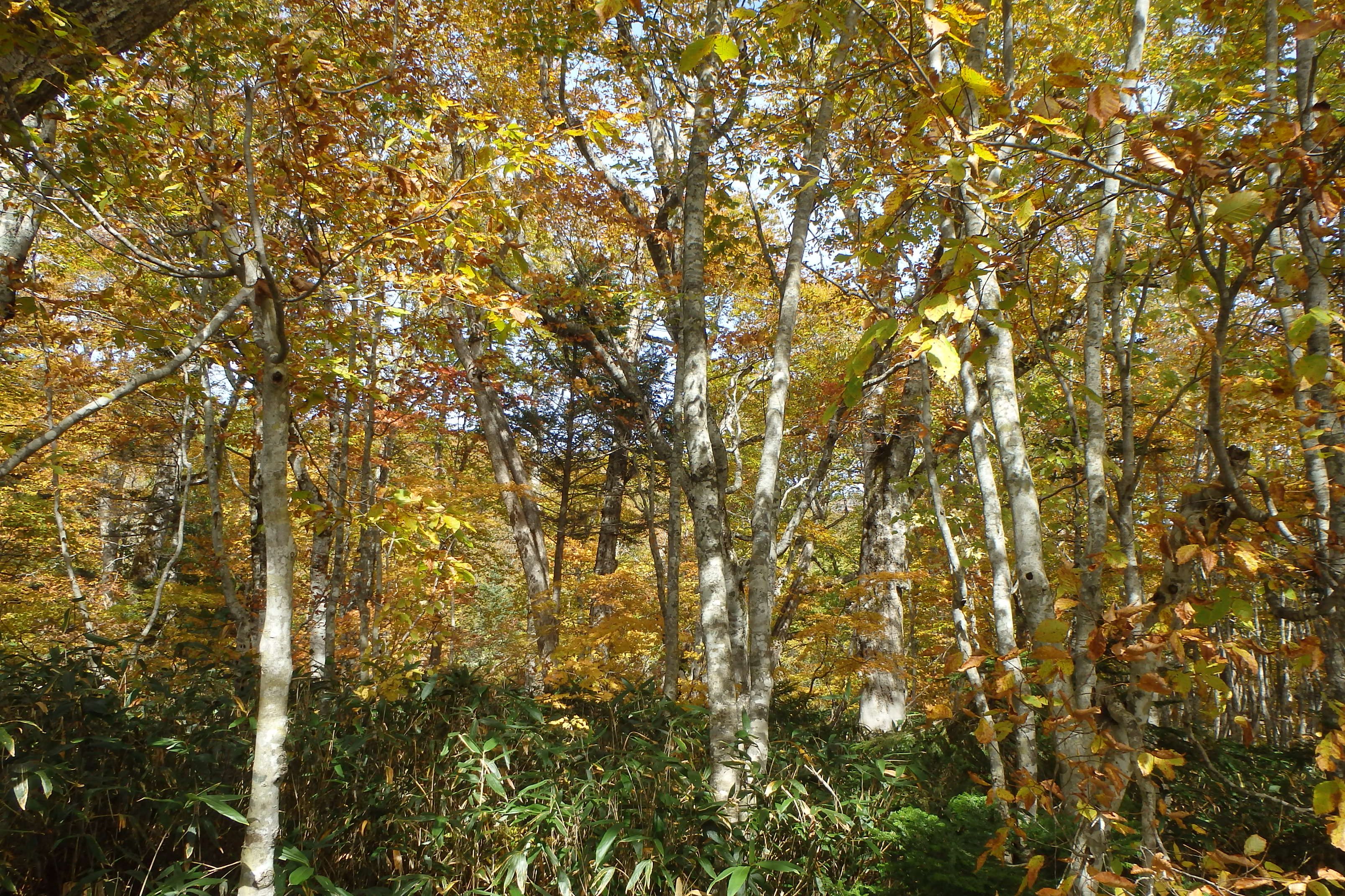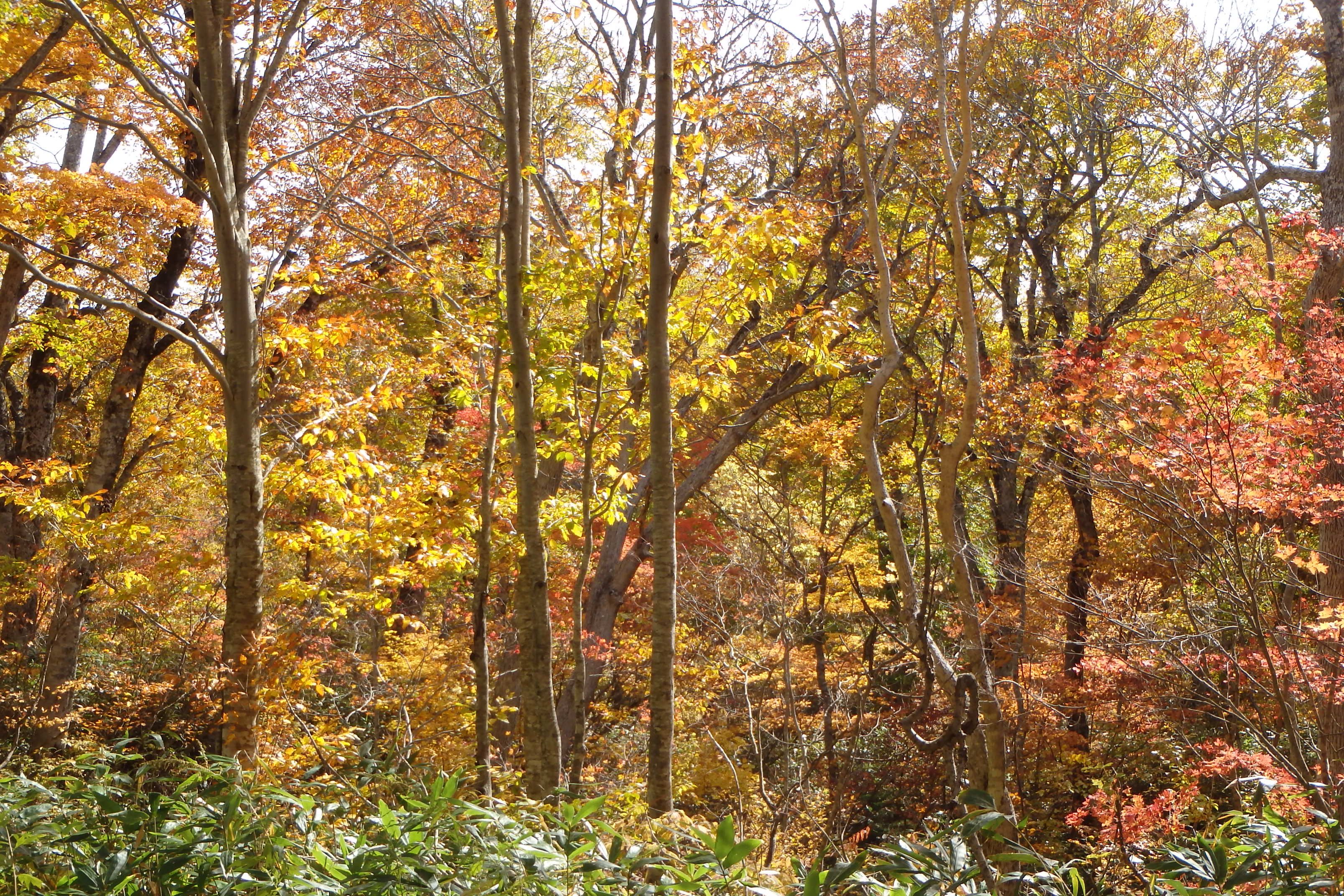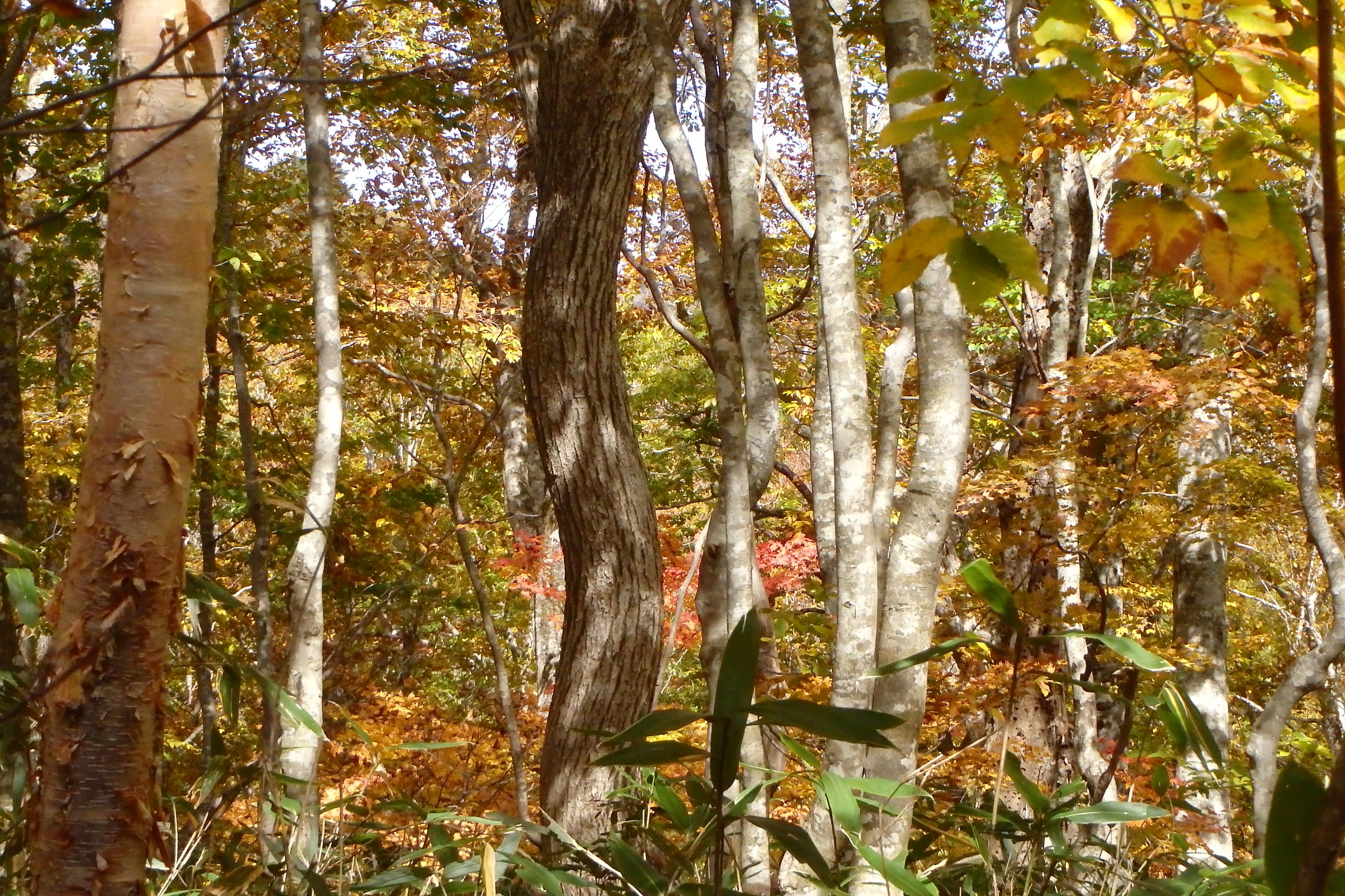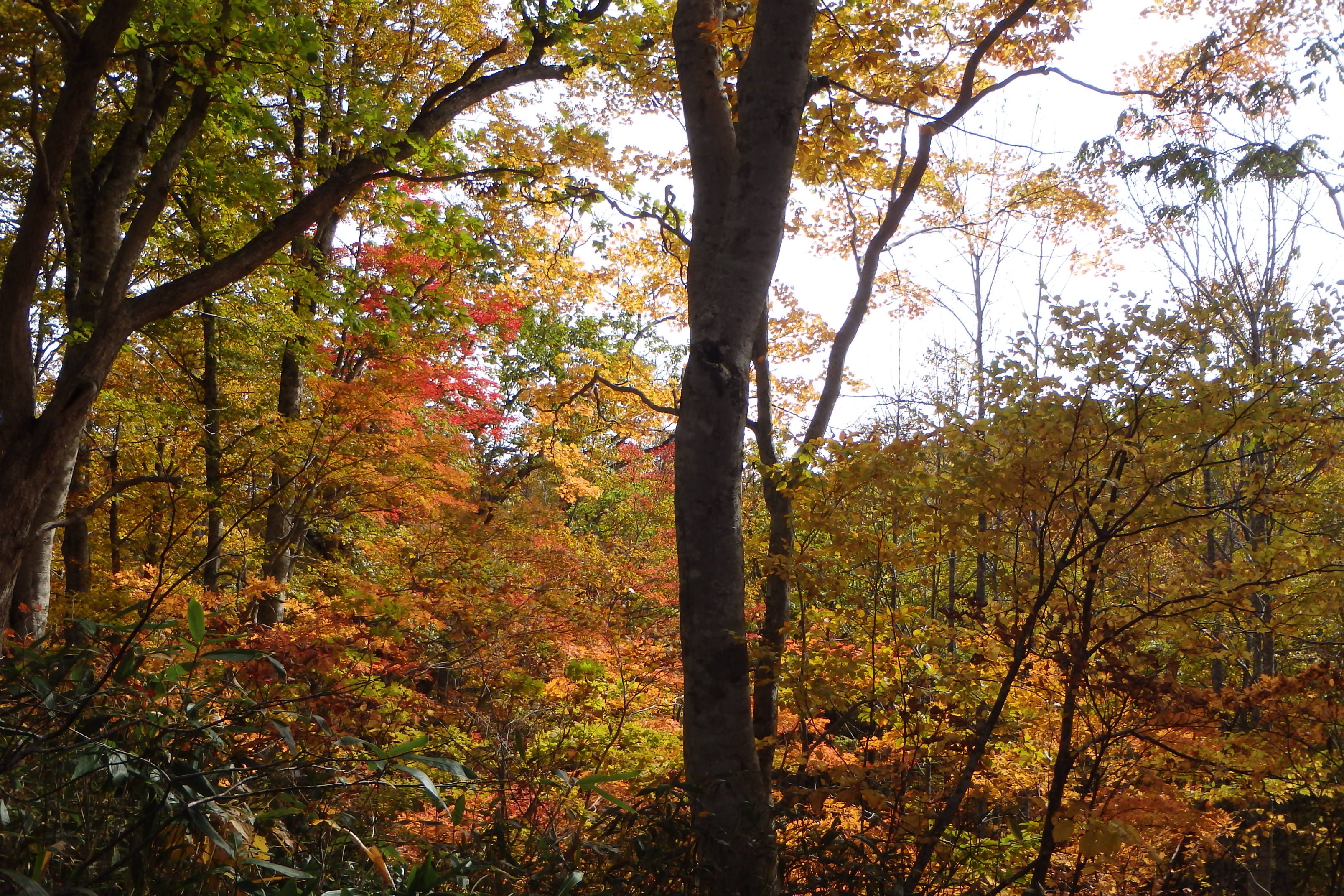 つづら折りのブナ坂を登ぼりきると、突然紅葉が見えてきました。