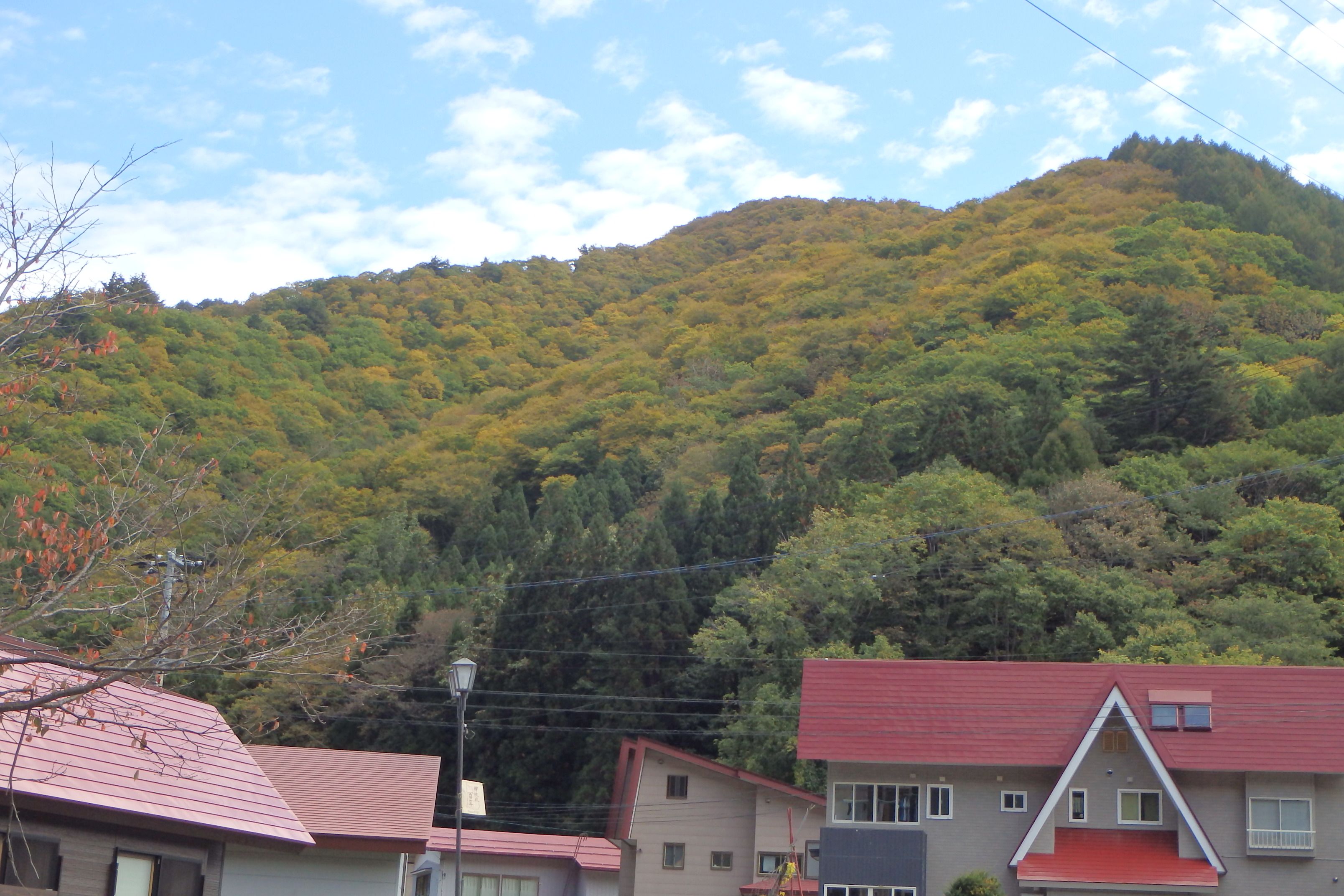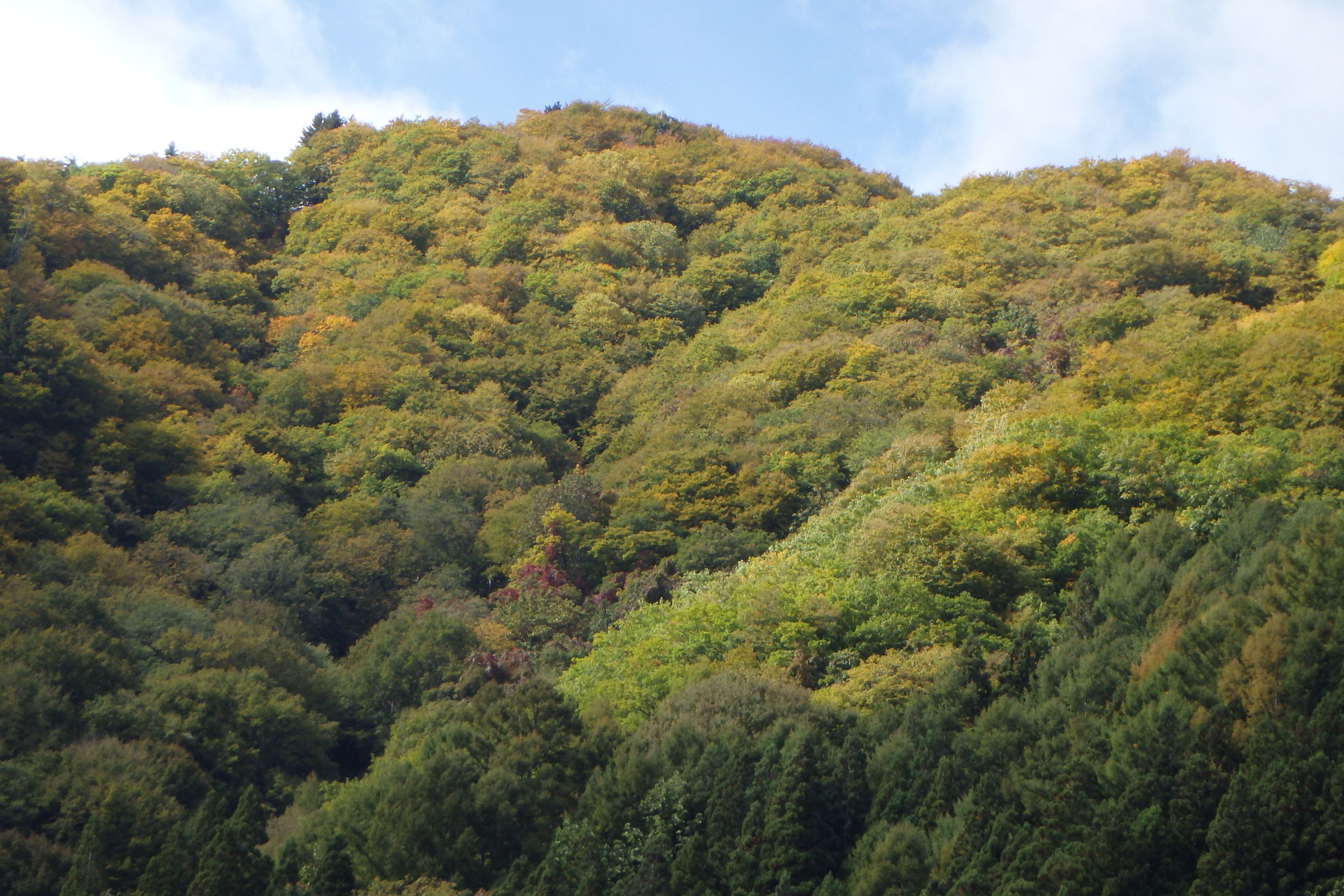 村中の橋の上から山を仰ぎます。山の高いところがいくらか色づきはじめてきたようです。