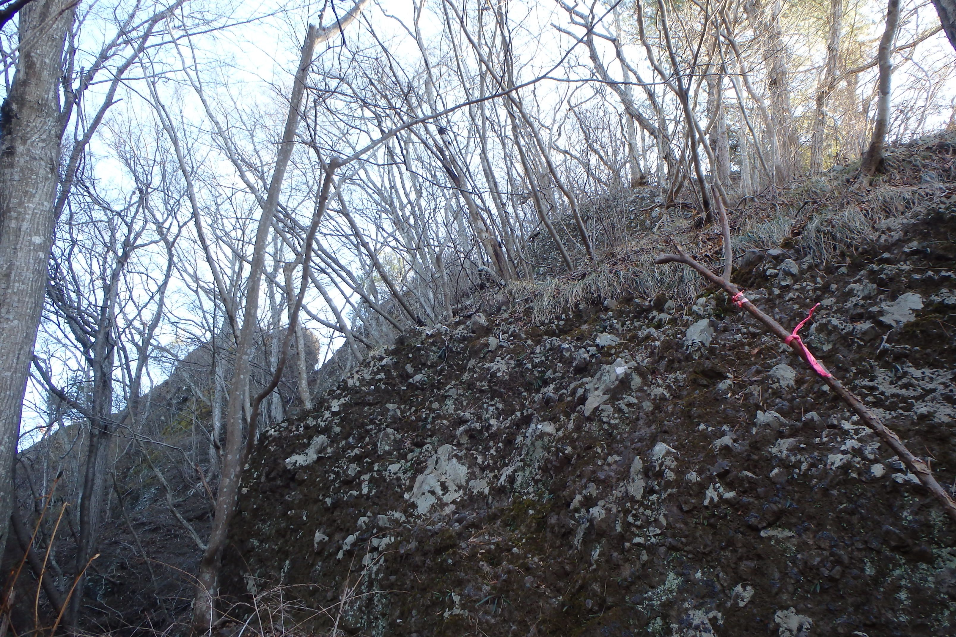 ゆるやかに杉林の中を登ると伐採地にでます。イノシシのものと思われる堀跡が目立ちました。雑木林に入ると道は険しさを増して、至る所にトラロープが張られていました。