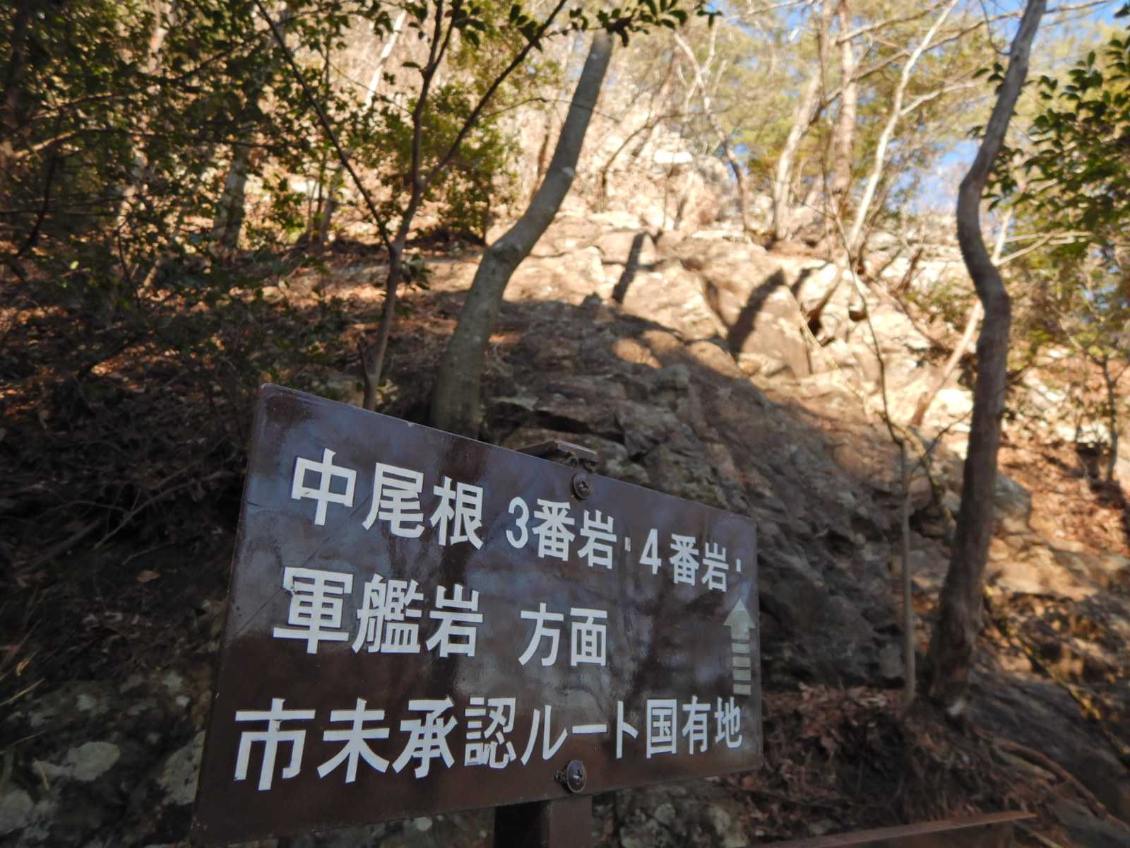 北コースから3番岩の鞍部まで登り一息、数年前に整備された道標をよく見ると、市未承認ルートと書かれている。