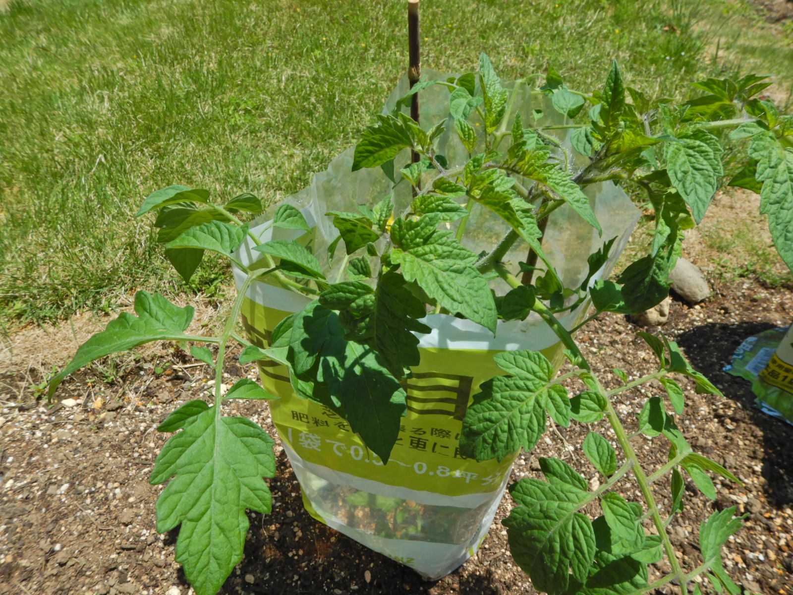 そろそろ支柱を立てようと考えていますが、5月いっぱいは風除けの袋は取りません。