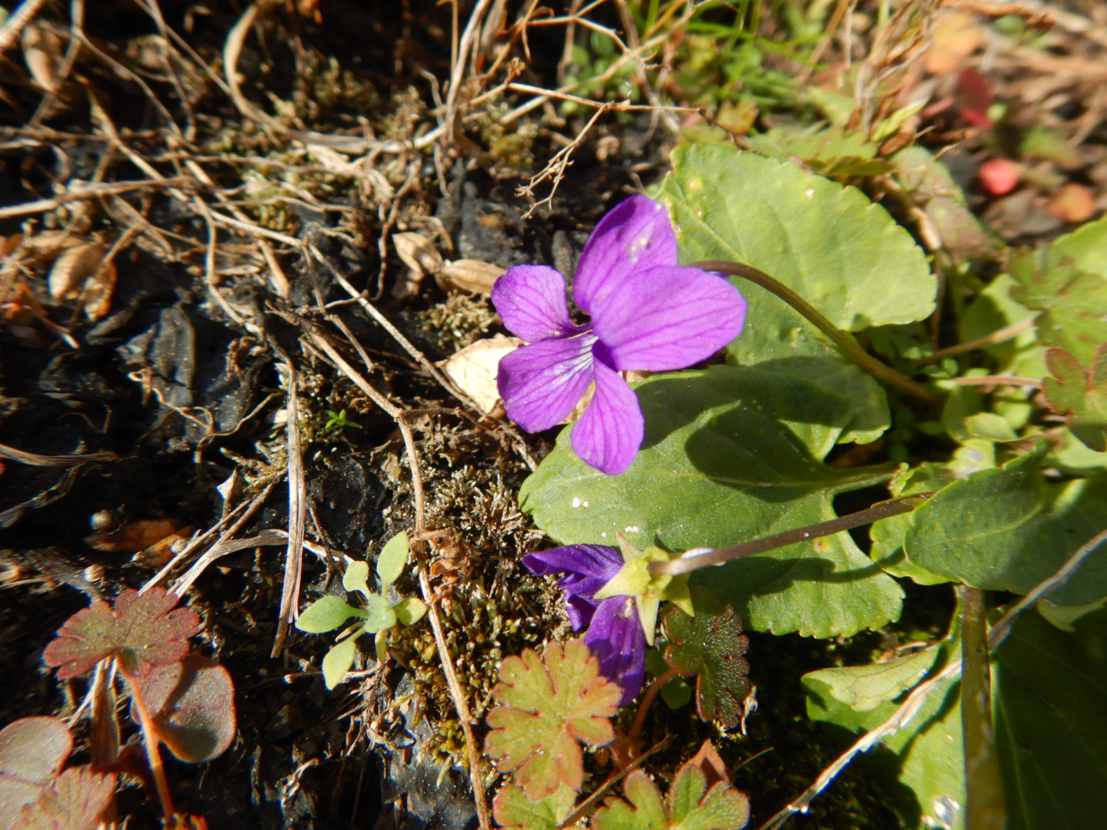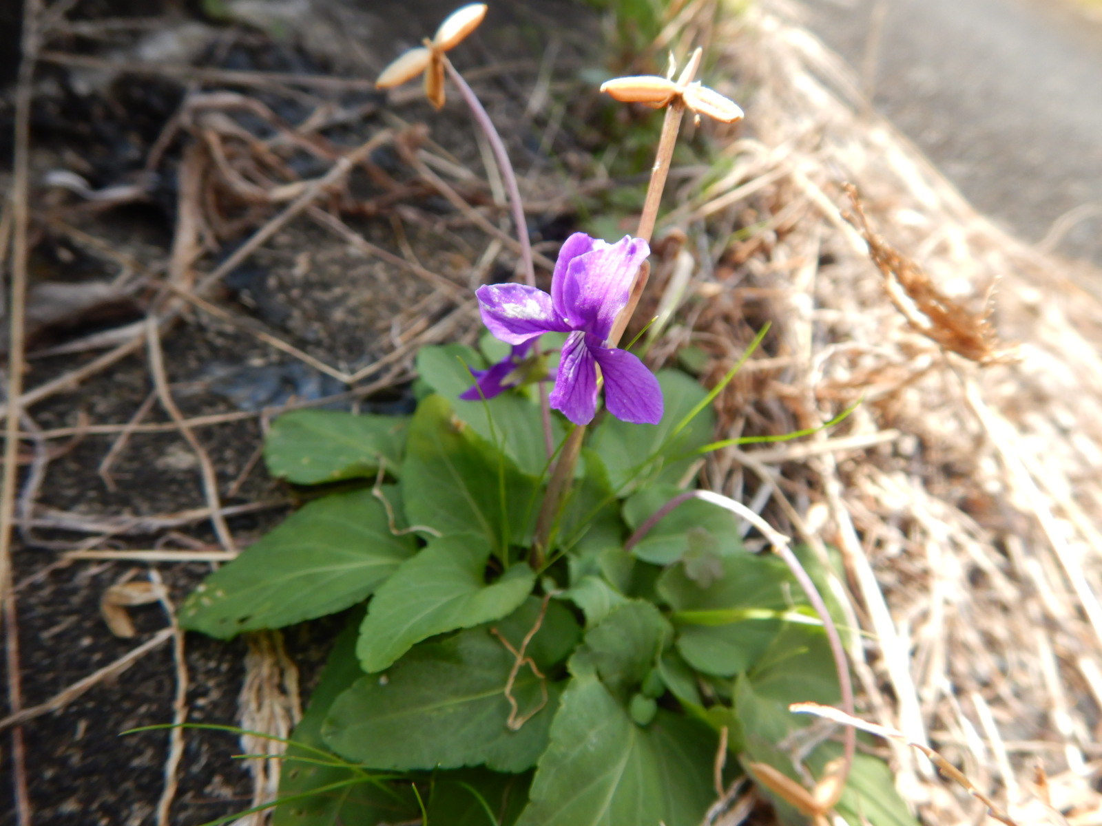 スミレの返り咲き、家の近くまで戻った歩道の縁石のところです。