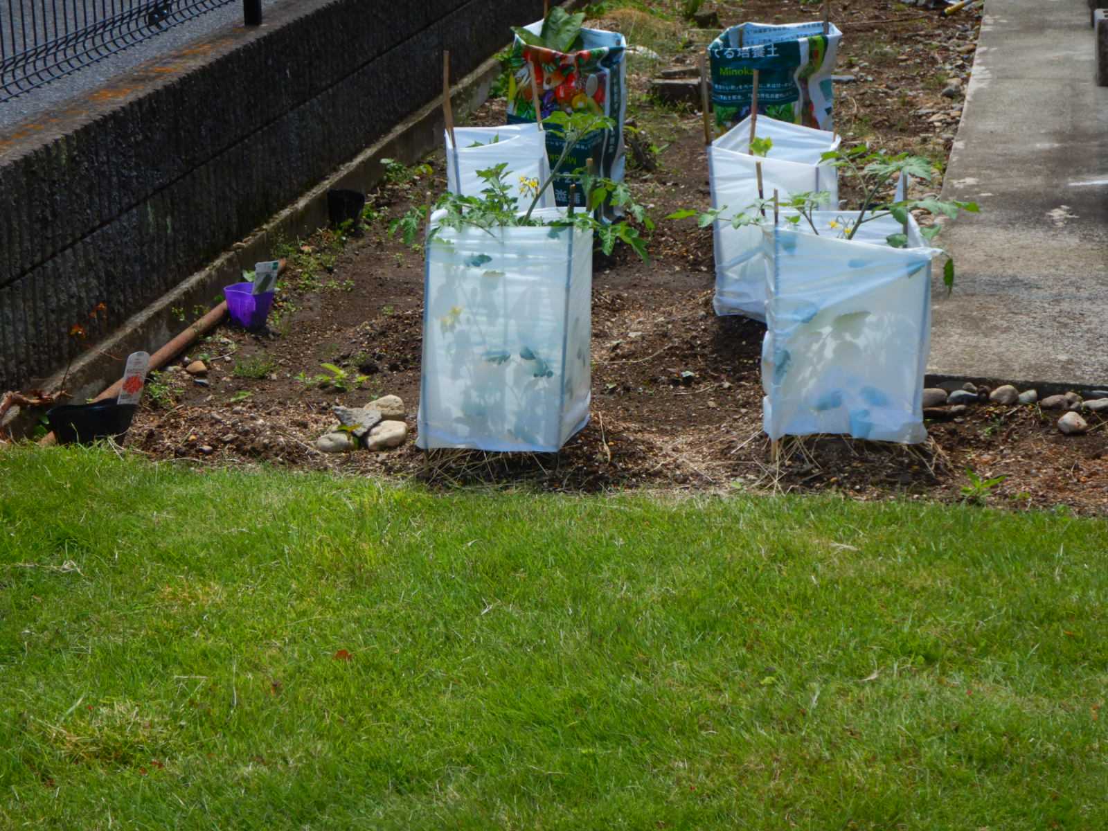 ミニトマト、キュウリ、ナス苗は少しづつ成長しています。