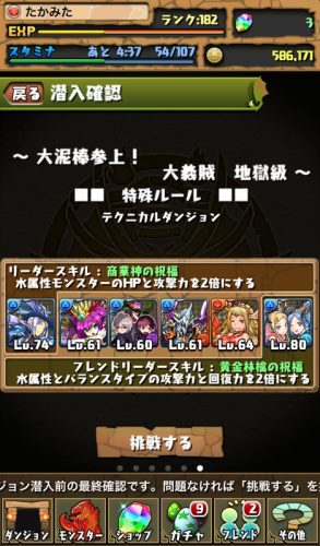 HP2倍・攻撃4倍・回復2倍の水パーティ+エキドナの編成です。