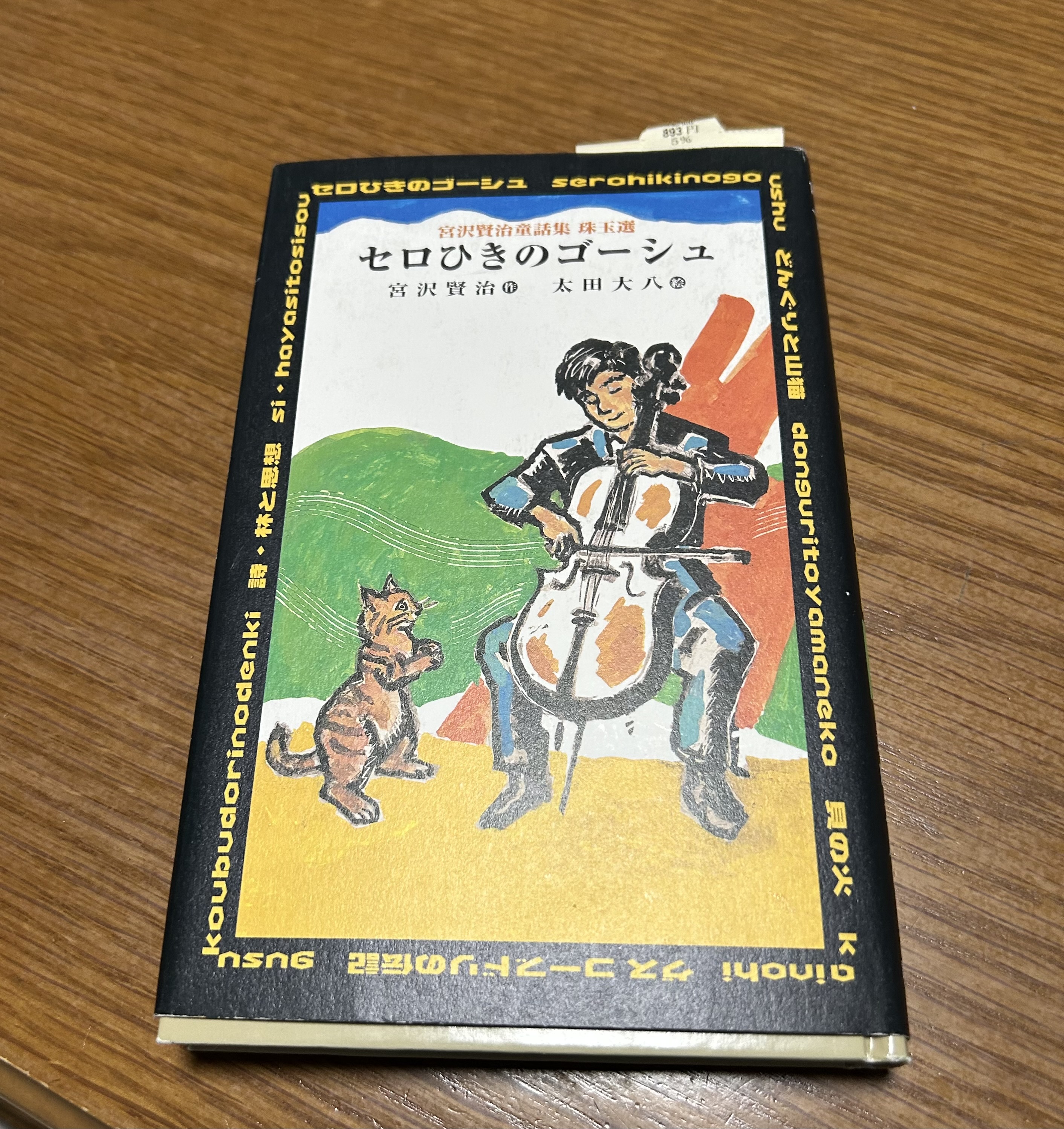 ゴーシュは、セロを弾く係でしたがあんまり上手ではないのでいつも楽長さんに叱られていますあと10日で仕上げなければなりませんゴーシュは,家に帰ってから毎晩夜遅くまで,ゴーゴーゴーゴー練習しました或る夜、1匹のネコがやって来ましたシューマンの『トロイメライ』をぜひ聴かせてくださいと言いますゴーシュは,生意気なと、怒って『インドの虎狩』をゴーゴーゴーゴー弾きましたら,猫は苦しがって火花を散らしながら走り回りましたあんまり苦しがるのでゴーシュは戸を開けて『もう来るなよ、バカ!』と出してやりました次の夜もゴーシュは,ゴーゴーゴーゴー遅くまで練習していましたらカッコーがやってきました『音楽を教わりたいのです』と言いますカッコーは真面目です『ドレミファを正確に教えてください』と言い、ゴーシュの手が痛くなるまで一生懸命にカッコーカッコーと鳴いて『どうもちょっと違うんです』と言いますとうとうゴーシュは怒ってしまいましたカッコーは、にが出そうとして何度も窓ガラスにぶつかって落ちたりしながらやっと帰っていきました次の日には、タヌキが小さな子どもが『僕の小太鼓と合わせてください』と言って,やってきましたそうしてゴーシュさん,なんだかここが合わないですねと言いましたそうしてたくさん練習をして帰って行きましたまた,次の夜ゴーシュは明け方近くまでゴーゴーやってそろそろ寝ようかと思っていましたら誰かがコツコツと戸を叩きます1匹の野鼠がとっても小さなこどもを連れています『先生,この子の具合が悪いのですどうか直してやってください』と言いますゴーシュが、自分は医者ではないと言うとこの辺りのものは皆んなびょうきになると先生のセロの音で治すのですどうかお願いしますと言います野鼠いわく先生のセロの音を聴くと血の巡りが良くなって病気が治るのですそうか、では聴かせてやろうとゴーゴーゴーゴー弾きましたら,野鼠のチビは元気になって帰って行きましたそれから、いよいよ交響楽団が『第六交響曲』を演奏する日になりました演奏が終わると,ホールのお客さん達はアンコールの拍手拍手で、鳴り止みません楽長さんはニコニコしながらゴーシュに何かちょっと弾いてやってくれと言いました楽しく可愛らしく宮沢賢治の世界が素敵です次の日は