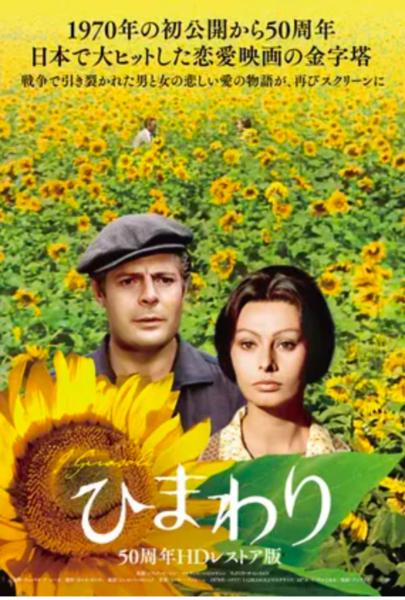 監督 ビットリオ・デ・シーカキャスト ソフィア,ローレン マルチエロ・マストロヤンニ リュドミラ・サベーリエワ第二次世界大戦の頃にジョバンナとアントニオは恋をして結婚しました新婚間もなくアントニオは従軍してロシアで行方不明になりました生きているのか死んでしまったのかさえ分かりませんジョバンナは、懸命に探しましたが分からないので僅かな希望を持ってロシアに行きました探し探して見つけたアントニオは若い女性と結婚して女の子もおりました雪の戦場で瀕死のアントニオを助けた彼女と結婚していたのでしたアントニオを一眼見たジョバンナはそこに来た列車に飛び乗りましたアントニオとは一言も話さずに一生懸命に探した夫は生きていはいましたが・・・一面の広い広いひまわり畑があまりにも悲しく見えます