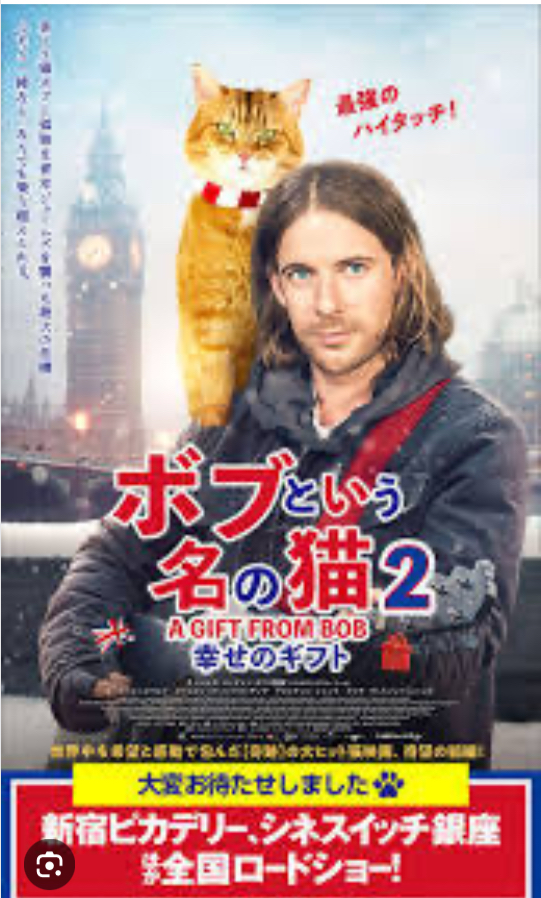 ストレート・ミュージシャンの青年はその年のクリスマスにも年末迄の生活費が無く電気も水道も止められて路上で雑誌を売っていましたちょっとしたご縁で野良猫のボブと知合いなんとなく世話をするようになりました彼自身が食べるのに困る貧しさなのになんとかして猫に食べさせていきます実話だそうです