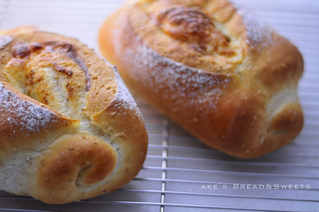 生地にゴマを捏ね込んで、スライスチーズを巻き込んだローフ。ゴマチーローフ posted by (C)ake.今日の朝食。チーズは少な過ぎたせいかそれ程味がしなかったけど、舟形にカットしたクープにのせた□クール■よつば バター有塩 450g_が香って美味しかったです。□クール■サイコロチーズ8mm 245g_ <ダイスチーズ>が欲しくなった~~この方が美味しかったろうなぁ。最近夜、夕食後に翌日の朝パンを作り始める事が多くて、早めにできるようサフ多めで作ってます。レシピはゴールデンヨット200g塩1.5%3gてんさい糖5%10gスキムミルク3%6gセミドライサフレッド1.5%3gショートニング3%6g水70%140g。これに今日のは炒ったゴマ適量とスライスチーズ3枚。(1個のパンに1.5枚)焼成時に各2~3gずつの有塩バタートッピング。40分パンチ40分程度の1次発酵(共に2.5~6倍まで)。2次発酵は40度で30分程度(2倍程度)。焼成は190度で23分くらい。3時間ちょいで焼けちゃいます。
