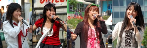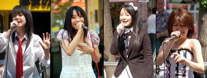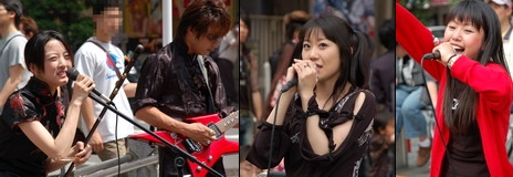 ゴールデンウィーク真っ最中の5月4日。この日は一日いい天気。気温もぐんぐん上昇、夏日を記録しました。秋葉原に観光に来る人も多く、ホコ天は大勢の人で賑わってました。 この日も万世橋の方がホコ天にほぼ常駐して治安維持に勤められていました。こうして秋葉原の安全は守られているんですね。そうなるとライブの方も告知の方も控えめにならざるをえません。有希さん(左)はかなり末広町寄りで歌ってましたが、歌い始めるやいなや、中止せざるをえない状態が何度か続きました。5月6日に石丸電気SOFT1でイベントがあります。また5月13日の「萌フェス」の出演も決まりました。夢色モンスターのakikoさん(中左)もなんとかホコ天で歌えました。ホコ天終了後はヨドバシ前でバンドで歌ってます。5月26日、秋葉原dressTOKYOの「AKIBA Fes.」に出演します。それ以外の方はすべてヨドバシ前で見られました。GANG BANG PARTY(中右)は早いうちにヨドバシ前で演奏してます。5月26日に秋葉原dressTOKYOでセミワンマンライブがあります。朝倉さくらさん(右)も中央改札出口付近で歌っています。5月26日に秋葉原dressTOKYOの「AKIBA Fes.」に出演です。今日も三倉愛子としてソロで活動していたLemmy Crisisの愛子さん(左)。5月26日にソロCD記念ライヴがHONEY ANGEL~mayu~さんと組んで御茶ノ水KAKADOであります。バンドとしては6月10日に六本木モーフに出演します。崎谷来未さん(中)はTXエレベーター前でライブしてます。5月27日に「VANQUISH」Vo.として秋葉原dressTOKYOに出演します。A'sh Doll(右)は2002年に滋賀で結成されたグループです。今年から活動拠点を東京に移してます。5月10日、新宿MARZに出演します。上野まなさん(左)は中央改札出口で歌ってます。5月26日にアートプレイス新宿、5月31日にリノレコードのメンバーと池袋LIVE INN ROSAに出演です。小比類巻里澄さん(中左)もその近くでライブしてます。やはり5月31日に池袋LIVE INN ROSAに出演します。そして9月1日にワンマンライブが決定しました。漆乃さん(中右)も一緒に歌ってます。同じく5月31日の池袋LIVE INN ROSAに出演です。櫻井水城さん(右)もその近くで歌ってます。この後であさがやドラムに出演しています。みーこさん(左)もキーボードでライブしてます。5月31日の池袋LIVE INN ROSAに出演です。RaM(中)は島の部分で歌ってます。5月13日に渋谷DESEOでワンマンライブがあります。こちらは初見のEther(エーテル)(右)。あきばお~四號店にてCDが委託販売されてます。5月5日にコミティア80でも販売があります。 栗樹いずみさん(左)もヨドバシ前で歌ってます。しばらくしてこのコスチュームにチェンジして再登場したら、ギャラリーの食いつきが急によくなりました(w5月19日にArt place新宿の「からくりかまきりぃ」に出演します。Saori@destinyさん(中)も中央改札近くでライブしてます。美生さん(左)は総武線ガード下でギターで歌ってます。4,5,6日と連続でCD発売記念のストリートやります。北海道から来た4人組Lip(左)です。札幌を中心に活動してます。歌だけじゃなくダンスでも見せてくれます。また秋葉原に来るのをお待ちしてます。華音女組(右)からは須藤夏実さんと小林彩子さんが出演しました。明日もアキバに来るそうです。 どうも連休中はずっと治安維持の方の活動が盛んになりそうです。これで安心して秋葉原の休日を楽しめますね。(ライブを楽しみたい方にとってはツラい状況ではあるけど・・・)