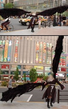 “外務大臣公認アニメ”として知られる「ローゼンメイデン」のキャラクターの中で、一部熱烈なファンに支持されているのが水銀燈。 特別編「オーベルテューレ」でも主役級の扱い方で登場してます。コミケでも多くのレイヤーが出る人気者。 そんな人気キャラがアキバに登場するのは、ま、当然って言えば当然なんだけど。 神田祭で賑わう前回の日曜日に見た水銀燈のコスチュームはハンパじゃありません。いったい全長何メートルあるんだ!という大きな翼をヨドバシ前で優雅に広げていました。 ジュディオングか小林幸子かというこの大掛かりなコスチューム。風が吹くとあおられて大変なことになります。よくぞこんなのを持ってきたもんです。私の知る限り、秋葉原でのコスチュームの“最長不倒距離”でしょう。ただ一つ残念なのは、このレイヤーが女性ではない点でしょう。コスチュームはいいんだけどねぇ・・・・惜しい!!