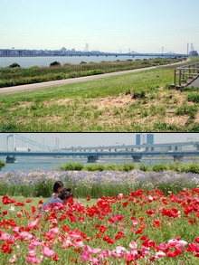 気候がよくなると自転車で遠出したくなりませんか。風を切る気持ちよさはこの季節ならではです。サイクリングは健康にもいいし、なにより環境にやさしいのがいいです。 私もマウンテンバイクを持っていて、以前はかなり遠出もしました。今回は天気がよかったので、荒川沿いにあるサイクリングロードを海のほうまで走りました。 自宅を出発し、荒川に向けて一直線。川沿いに出ると一気に視界が広がります。 健康ブームもあって、ジョギングしている人や本格的なロードレーサーに乗ったチャリンコ野郎がけっこういます。川沿いを海に向けて走っていると、途中にお花畑などあって和みます。家族で散歩している人も多いですね。 さらに潮風に逆らって海に向けて走ると荒川の河口に出ます(ここらへんは風がキツイ!)。 走りつかれた後に河口に出て、目の前にドーンと海が広がるこの瞬間がまた気持ちイイ!思わず「♪うーみよぉー オレのうーみよぉーっ♪」と歌いたくなります(古い?)。 そこから左に曲がると葛西海浜公園です。 隣接する葛西臨海公園には水族館や大観覧車があり、海沿いにはなぎさがあって海で遊ぶ事ができます(泳げないけど) 葛西臨海公園にも四季の花が咲いてます。遊歩道も整備され、野鳥観察のコースなどもあります。芝生の広場もあるので一日中ごろんとしてるのもいいですね。 都心から近く、まったり過ごすことができるので、天気のいい日にはお勧めスポットです。 半日自転車に乗ってたら真っ赤に日焼けしました。これからサイクリングを楽しむ人は紫外線対策もお忘れなく。
