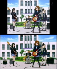 前回の更新で話題にした『けいおん!』の放送フォーマットの話。 アニメの製作自体は16:9のフォーマットだけど、TBSの地上波では4:3で放映されるため上のように左右が切れてしまい、BS-TBSでやっと本来の16:9で見ることができます。 TBSで放送するアニメがすべてそうかと言うと、『バスカッシュ!』などは16:9での放送です。 どうやらMBS・CBCなどの系列局で制作しているアニメは地上波でも16:9で放送し、TBSの自社製作は地上波を4:3で放送しているようです。(『けいおん!』はTBS、『バスカッシュ!』はMBS製作) どのような理由でこうなってるのかは不明ですが、左右の切れたアニメを見なけりゃいけないのはストレスがたまります。TBS様、ご一考を。桜高軽音部の『ふわふわ時間(タイム)』も発売されました。 学園祭での演奏のように、唯ちゃんの声がガラガラだったらどうしようかと思ったけど普通に歌ってました(そりゃそうだ)。 演奏の練習用に、それぞれの楽器を除いたバージョンも収録されてます。これでますます「『けいおん!』見て楽器買っちゃいました」という人が増えそう。(放送終了後は中古楽器市場がダブつく予感・・・) それぞれのキャラクターソングも発売決定です。 先行して、さわ子先生の伝説のバンド『DEATH DEVIL』の曲「Maddy Candy」の着うたが先週から配信されてます。 ジャケットのさわ子先生・・・・目がイッちゃってます! BS11で放送中のアニメ『初恋限定。』の本編終了後の「放課後トーク」では、紬役の寿 美菜子さんと唯役の豊崎 愛生さんのトークが見れるので、声優が気になる方はチェックしてみてください。 ちなみにこの二人は、ユニット「Sphere(スフィア)」のメンバーとして『初恋限定。』のOP「Future Stream」も歌ってます。これもいい曲ですよ。 8月30日にJCBホールでのコンサートも決定してます。桜高軽音部よりも一足早いライブですね!「Future Stream」/Sphere (初回限定CD+DVD) ヘッドフォンが売れたり携帯が話題になったりと、グッズ関連でも話題を振りまく『けいおん!』人気。どこまでユーザーが踊らされるのか見物です。・・・・と、キャラクターソングを全部予約した管理人が踊りながら更新しましたとさ。(踊らされてるんじゃない! みずから踊ってるんだっ!)「けいおん!」イメージソング 平沢唯「けいおん!」イメージソング 秋山澪「けいおん!」イメージソング 琴吹紬「けいおん!」イメージソング 田井中律