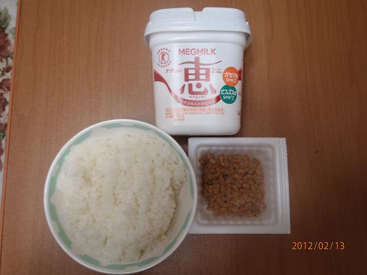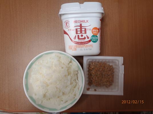 今日の朝食はこれです。ご飯に納豆、それとデザートにメグミルクのヨーグルトです。この前の朝食と一緒ですね。これを食べて、元気出して行きましょう。それでは、今日のブログはこの辺で。今から、仕事に行く準備をして出かけたいと思います。それでは皆さん、良い一日を。明日、また書きたいと思いますので、見てくださいね。それでは、(^.^/)))