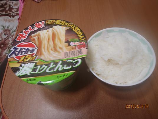 今日の朝食はこれです。(/ ̄^ ̄)/ ̄ \(。_ 。\)カップラーメンとご飯です。カップラーメンを食べるのは久しぶりのことです。久々に食べると美味しいものですね。( ゚v^ ) おまけに僕はトンコツが好きなので尚更です。麺を伸びないうちに食べ、残ったスープをご飯にかけて食べる。これが、僕流の食べ方です。う~ん、もうこれだけでお腹一杯です。ε-(´∀`*)ホッ以上が、今日の朝食でした。それでは一旦(^o^)/