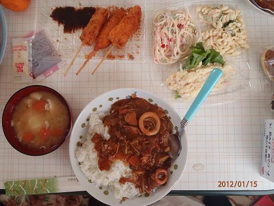 午前11時に帰ってきて、ちょっと早いお昼を食べ、一眠りして、今起きたところです。今日のお昼ですが、本日はこれです。海鮮カレー、お味噌汁、サラダの盛り合わせ、串かつでした。カレーとお味噌汁は義母が作ったもので、美味しかったです。味付けがちょうどよかったです。あとは、サラダの盛り合わせはセブンイレブンで買ったもので、マカロニサラダ、シーザーサラダ、じゃがサラダが入った3種の盛り合わせでした。串カツは豚肉とえびの串カツでした。これらを食べて、もうお腹一杯です。世は満足じゃ。以上が、今日のお昼でした。それではまた。