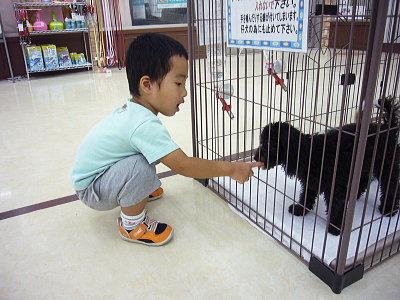 今日はパパのメガネとサングラスを新調するために隣の隣の浜にあるカインズホームっていうホームセンターへ出かけました。メガネとサングラスを5000円と7000円で作れるので両方とも買っちゃいました。でも、サングラスの方はUVコートで2000円とフレームが凝った作りだったのでもう2000円追加になってしまいました。ちょっと足が出た!どうせ直ぐに傷を入れて買い換えることになるので安いレンズで良し!ってのがパパの考え。パパが買い物をしている間にママは日用品を購入するはずだったのがいつの間にか2階のペットショップへ・・・・以前、宝塚のドッグ・ラン・ドッグへ行ったときは見向きもしなかったのに今日はめっちゃご機嫌で犬とふれあっていました。ケージの中に手を入れちゃダメなんだけど・・・・手をなめられる度にはしゃいでました。しまいには背中を向けて頭をなめて貰おうとしてました!もちろんなめてはくれませんでしたけどね。そして大きな犬にも臆することなく上手に接してくれました。以前はバシバシ叩いていたので横で見ているこっちはハラハラドキドキもんでした。