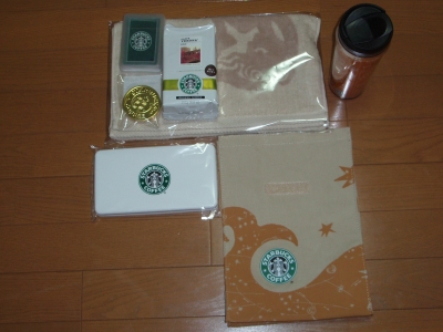スターバックスの福袋が欲しくて、買いにいってまいりました。それがコレです。タオル、トランプ、チョコレート2枚、コーヒー豆、ランチボックス(サンドイッチとかいれられそうな組み立て式)、ランチボックスを入れるバック。そして、ムスコが持っているのが今年のタンブラーだそうです。わかりにくいかな?ランチボックスを入れるバックが、どうしても何者かわからなくて、mixiのスタバコミュに行って始めて知りました。何を入れるものなのか、ダンナと悩んでしまって・・・ははは・・・でも、使わないかも・・・うーん、これにCDやらマグカップやらが入ってるセットがあったらしいので、そっちのがよかったかなというのが本音。でも、これで3000円。コーヒーだけでも結構するから、まあまあといったところでしょうかね?どうですう?