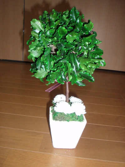 今日はあんまり体調がよくなかった(胃が痛い~)のですが、Mちゃん講師にて、ひさしぶりにプリザーブドフラワーをやってきました。今日はトピアリーです。見てください。あら、ちょっと画像がでかかった・・・このですねえ、グリーンで円形を作るのがなかなか難儀で・・・・このグリーン、写真だとよくわからないかもしれないけど、ところどころにラメがちってて、ちょっとクリスマスっぽいんですよ♪しばらくやってなかったので、ワイヤリングを忘れちゃって(汗)だいぶ、先生Mちゃんに直してもらいましたけど・・・・なんとか3H弱で完成しましたあ。家にグリーンがなかったので、とっても新鮮です。うれしいなあ。また作品が増えて。これで3000円です♪今度はクリスマス用に、キャンドルつきのものと、正月用の飾りをやるんですが、どっちをやろうかなあと迷ってます