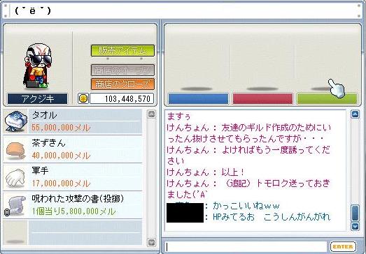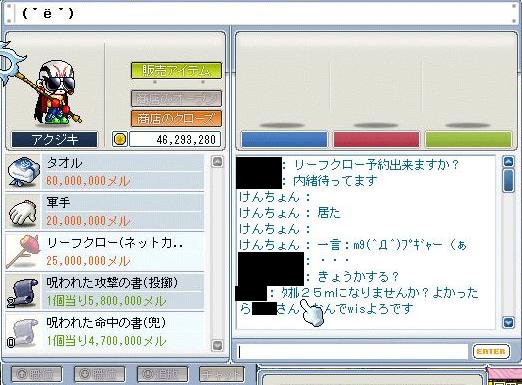 今日は 狩ろうと思ったら金欠でずっと露店しとった!でもな全然売れNEEEEEEEEEEEEEEEEってなわけでもっかい行ってくるわさ じゃおいらリッチになるまで頑張ってくるべ! え!?終わり!!!!?END露店はいいから狩れよ!!