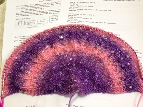 かぎ針編みでパイナップル模様のケープを編んでいたナスカのソフトスパンシークカラ―・・・ポップカラーのスパンコール入り毛糸。 【再入荷!!数量限定60%OFF】ナスカ ソフトスパンシーク カラースパンコールが仇になり、あまりにもギラギラでしかも、色までがめっちゃ派手・・・途中まで編んではみたものの意欲が沸かず結局ほどいちゃいました・・・(;-_-)仕方なく、エブリデイカラフルでネックウォーマーでも編もうかと編んでみたけど・・・風邪のせいもあるのか、編む気が起きず・・・(ノ_-;)ハア...それでも、この問題の派手な毛糸を何とかしたくて棒針で試し編みなどしてみました・・・ラベリーの編み図を何点かセレクトして試し編みしてみたら・・・おや~(・_・?)この糸って、棒針だとそんなにイヤな感じに見えなくないですか?かぎ針だと色の変わり方が極端に見えてたけど・・・これならショール編んでみてもいいんじゃないのかしら~って、事で・・・ こちらのショールを編もうかと、試し編み・・・棒針で編む半円形のショール・・・編み始めの作り目の仕方がイマイチよくわかってなくて適当に合わせちゃった・・・(^▽^;)アハハ・・・でも!色のグラデーションが徐々にに変わっていくのが見えて編んでいてとっても楽しいかも~そんな訳で、ソフトスパンシークカラ-・・・リベンジ出来るかなぁ(笑)注文してる針先が来るまで・・・こっち進めようと思います!さぁ、続き編むぞ~(=v=)ムフフ♪それでは~ よかったらこちらもポチっとお願いしますにほんブログ村