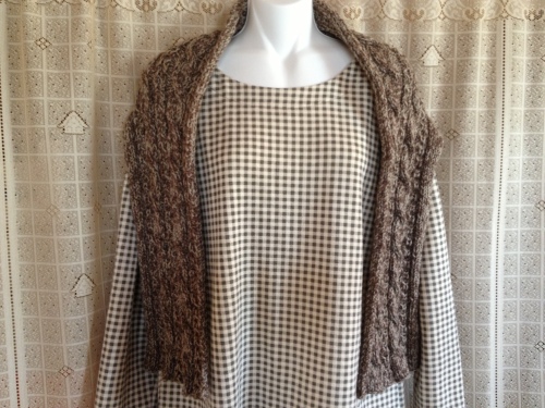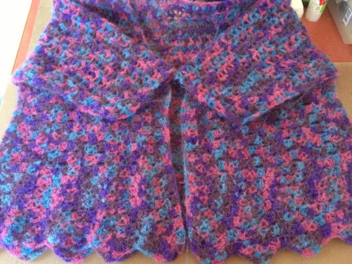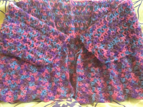 ナスカのソフトスパンシークカラーで編んだショールがやっと完成しました~ヾ(〃^∇^)ノ 気になっていた色もこんな感じになりました(*゚▽゚)ノ 全体図を何とか撮影できないかと頑張ってみたんですが・・・ちょっと無理でした・・・羽織るとこんな感じになります試しに前でまとめてみるとこんな感じに・・・(って、何時もながら芸がなくてスイマセン)ハッキリ言って、こんな色のショール羽織ってたら・・・何かと間違えられそうな気がしちゃいますねぇ(^▽^;)アハハ達成感はすごくあったんだけど使えない代物また編んじゃったかなぁ・・・と、ちょっと反省・・・でも!軽くて暖かいので家ででも使おうかと思います。 で、今回初めてブロッキングというものに挑戦してみたんですが・・・何か、変わり映えしない感じですよねぇ・・・引っ張る加減とか、どのくらいスチームを当てていいものやらわかんない事が多くて・・・ウーン (Θ_Θ;) ピンを外してみるとまだ若干のうねりが残ってるわ端の方が捲り上がってきちゃったりするわで・・・ちょっとガッカリ・・・(≡д≡) でも、次回はもうちょっと上手くブロッキングが出来るよう頑張ろうと思います!さあ、それじゃチュニックベストの方も頑張ろうかな~それでは~(o^∇^o)ノ 良かったらこちらもポチっとお願いしますにほんブログ村