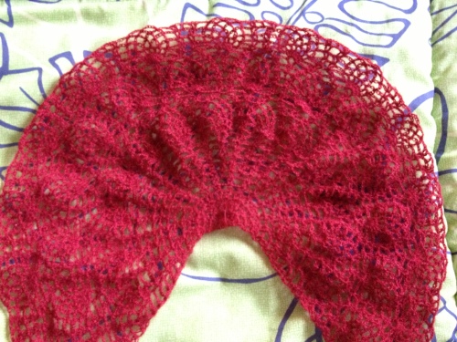 黙々とモヘアのカーデ編んでいたら・・・これだけ大きく成長しました~(゚∇^*) 形が見えてきましたよ~ ここまで編んで残り2玉になったので先に襟と袖を完成させて・・・残った糸を使い切って丈を編めるだけ編ことにしました!でも・・・案外、前立て分と縁編みの分も考えると本のまま編んだら、ちょうど良く糸がなくなるかも・・・?でもこれで、だんだん完成も見えてきたので後もうちょっと!頑張って編もうと思います(*'ー'*)ふふっ♪で、ここまで編めちゃうと・・・自然とまた違うものが編みたくなってきちゃう~で、次に編もうと思っていたものを早速!試し編み~これ見て・・・ピンと来た方もいらっしゃるんじゃないかと・・・そうなんです!お友達のふゆ子さんが編んでいたベストアイズの・・・え~と、ショールじゃなくてストール!ふゆ子さんがセイカで編んでいていいなぁ・・・って思ったので持っていたプチセイカのエンジで編み始めましたちょうど本の色と同じような色だったし・・・ゲージがピッタリだったのでこのまま編んでしまおうかと・・・( ̄∀ ̄*)イヒッ何だかこっちばっか編んでしまいそうな気がしなくもないけど・・・そこはまぁ、気分次第!という事で・・・楽しみながらのんびりと・・・(*´∇`*)編んでいこうと思います! 良かったらこちらもポチっとお願いしますにほんブログ村