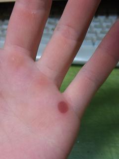 今日も1日お疲れ様です!!昨日の花笠に参加してかなり疲れてました。朝起きたら身体が動かない!!手は豆だらけで仕事でゲンノウ打つにも痛い!!身体がだるくて動くのもツライ!!↑左手の小指つけ根のきれいなまん丸お豆サンです。 右手は1円玉くらいの大きさを筆頭に数個(泣)もう太鼓を叩く体力がなくなってきてるんかな??今年で引退?来年大丈夫かな(汗)思ったよりも大きかったけど疲れが残ってるだろうと思って今日のバイトは休みもらっててよかった~♪ゆっくり休んで明日からの仕事にバイトにまた頑張ります!!