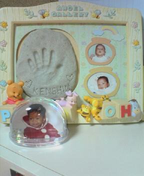 みなさ~ん、お子さん達の写真ってどうしてますか?きちんとアルバム作ってますか?堅真はもうすぐ1歳。なのに・・・私ってば全く何もしてません(汗)とりあえずザザーーッとポケットアルバムにはさんでるだけ。コメントもなし(-。-;)今思い出すと私の小さい頃のアルバムって母は共働きで忙しかったはずなのにコメントをちゃんと書いたりして割ときちんと作ってくれてました。そんな母の努力もむなしくそのアルバムは当時小学生だった私が勝手に写真を剥いだりして今では写真はバラバラ、コメントだけが悲しく残ってます(^-^;子供の頃にしてしまった事とはいえ申し訳ないデス・・・。で、写真の話ですがケニーが生まれる前にいくつか写真たてを買いました。初めは張り切ってやってました。↑コレ手形とるの結構難しかった! 嫌がって動いてしまって何度もやりなおしたな~。 せっかく買ったのに箱からすら出してなかったこの写真たて。毎月1枚ずつ入れなきゃいけないのにまとめてドーンと12枚はさまなければいけませぬ・・・。↑ちなみに真ん中はケニーじゃないよ。そしてなぜか100円ショップに行くとつい写真たてを買ってしまう私。周りをいろいろ飾ったりしてオリジナルの写真たてを作ろうって思いながらこれまた袋の中に入ったまま。これはほんの1部です(^-^;私いったい何がしたいんだろう・・・??こんなにあっても飾るとこないのにさー。とりあえず12枚飾るやつは早く作ってしまわなきゃね。もう誕生日がきてしまうよー!!!もしアルバム整理でいいアイディアがあったら教えてくださーい♪(なるべく簡単&楽チンなの希望、笑)
