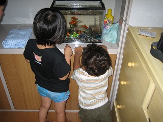久々の更新です。気がつけば2週間以上してなかった言い訳ではないけど毎日毎日体がだるい!!そして眠い!寝ても寝ても寝たりない私・・・病気か!?夏バテかなぁ~とにかく今の願いは「誰にも邪魔されず思う存分眠りたい!」こんな願い事もなんか空しいけど~。゚☆,。・:*:・゚★゚☆,。・:*:・゚★゚☆,。・:*:・゚★゚☆,。・:*:・゚★゚☆,。・:*:・゚★日曜日はオフ会に行ってきました!この夏、何もイベント事もなく楽しみにしていた夏祭りも台風のせいで延期。なので私はこの日をかなーーり楽しみにしてたのよ~♪場所はNさん邸。最近お引越ししたNさんの引っ越し祝いを兼ねてのオフ会でした久びさに会う方・初めて会う方もすぐに馴染んですぐにくつろいだムードにそんな中ケニーはNさんの娘ちゃんAちゃんときんぎょを観察。ケニー 「ホォ~これが金魚かぁ~!」Aちゃん 「かわいいやろ?」すっかりお腹が空いた私は食べる食べる!お腹空きすぎて写真撮るの忘れちゃったよNさんが作った「ゴーヤチャンプル」・banさんが作った「チキンカレー」・Hさんが作った「サザエの炊き込みごはん」ぜぇぇんぶ頂きましたわよ、オーッホッホ!おまけにも飲んで最高~♪食べまくる母をよそにケニーはプールへウッヒョ~!みんなで入った方がたのしいぜ!(byケニー)その後banさんが息子のOくんにAちゃんおさがりを着せました♪もぉぉ~めちゃかわいいかった!絶対男の子には見えなかったもんね。そしてこれから髪の毛を伸ばす事に決定~ロン毛のOくん楽しみだわ~!NさんちのFAXで遊ぶケニー。これとドアの開け閉めがしつこいのなんのって!将来「ドアマン」になる事も決定したしね(笑)あ、ちなみに端に写ってるのはさくちゃんパパのビーちゃん。噂どおりの爽やかパパさんで横にいると爽やかな風が~♪途中参加できなかったアメリカスさんからのメールに全員大爆笑!!!面白ろすぎだよ~!計画してた網は仕掛けられなかったけどね~(笑)そして!念願の再会を果たしたさくちゃん&ケニーケニーは久々の再会にちょっと恥ずかしがってた様子。そんなケニーの態度にさくちゃん業を煮やしてかさくちゃん 「ケニーこっち向いてよ~!」ケニー 「は...はずかしいんだよぅ~。」さくちゃん 「スキスキ~カプッ!」ケニー 「ボクも~ってアイタタタッ!」この後は2人並んで仲良くお昼寝しました。今後の2人がとーーっても楽しみな母でございますあっと言う間に時間が過ぎて気がつけば夜8時過ぎ。バタバタして帰ったのでありました。片付けもあまりせずに帰ってNさんごめんなさいとっても居心地のいいお家でした。またお邪魔させてくださいね!そして今回集まったみなさん・今回参加できなかったみなさん近いうちにまた会いましょうねそれからケニーは風呂に入って1分もしないうちに爆睡そして興奮しすぎたのか夜中に38.7度の熱が~。座薬を入れたら朝には熱も下がってすっかり元気な様子。一応病院にも連れて行ったけど「夏風邪??」って曖昧な感じだったし。あの熱は何だったの~~?おかげで今日はゆったり天神ランチだったのに中止になりました。あぁ~残念