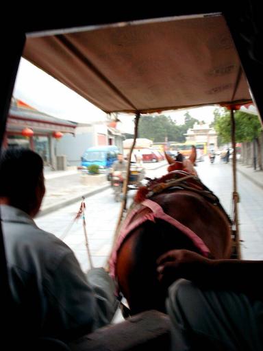 孔子廟の見学中に記念撮影があり パンフレットの中にその写真を貼ってもらい なかなかに良い記念になりました。 次に孔子の直系子孫とその家族が住んだ邸宅である、 孔府というところへ行きました。 ガイドさんが機転を利かせて馬車での移動結構な距離があったんですが 軽快に走ってます。 こちらがその勇姿。曲阜という田舎では、 写真のような馬や、驢馬、騾馬など 観光用以外にも使われているようです。 住んでいたところなので墓がとにかく多い。孔府の平面計画は伝統的な中国の邸宅様式で、 正門の前方にある公的区域と後方にある私的区域からなります。 公的区域部はは勅使や高官を接見や、 祭礼や所有地などに関する事務を行う場所であったようです。そのため、貴賓や国賓を接待する際、 上記のように一番下の文字が遠目には 「干」なんですが、近寄ってみると 「王」になっています。 ちょっとした気配りも必要だったみたいですね。