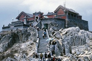 【午後】 世界遺産泰山観光。 山頂付近の南天門まで往復ロープウェイを利用! その後、山頂の玉皇頂まで簡単なハイキング。 ------------------------- 孔府より一路、泰山へ。『岱宗(たいそう)それ如何、斉魯まで青いまだ了(おわ)らず』 -唐代の詩人・杜甫- 斉と魯を隔てているのは、泰山である。この東方の名山は、高さが1,524メートルである。 泰山は岱山とも書き、5つの名山のうちの宗(かしら)であるから、岱宗という。 泰山の青は斉や魯の地からも遠望できるということである。 余分なことだが、5つの名山のうち、かしらといえる山は、本来、中国の中央にある嵩山(すうざん)であった。 それが山岳民族(斉の姜族(きょうぞく)もその1つ)の頽落(たいらく)により、平地で生活する者たちの敬仰が泰山へ集まった。 泰山が万民の認める天下一の名山になるのは、秦の始皇帝がこの山で天地を祀(まつ)る封禅の儀式をおこなってからのことであろう。この日は午後から雨模様のため 靄(もや)で山全体が見渡せることができません。 麓までツアーバスで移動。シーズンオフということもあり、人影もまばら。 この階段の向こうに、中腹あたりまで行く 乗り合いバスがあります。 バス周辺で物乞いがいたため 写真撮れず(;´Д`A ``` 中腹に着いてから少し歩くと次の目的地を示す案内が。一番上に書かれてる「玉皇頂3.50km」を目指します。このすぐ近くにロープウェイがあり、それに乗ること10分弱。下から階段で登ってきた人と ロープウェイ組がここの門のところで合流します。 上の登っていく途中に、 門があったり、お寺があったり。この左側の眼鏡をかけた人が 今回お世話になった添乗員の張さん。 すごくガイドがうまく、次いくなら またこの人にお願いしたいぐらい。山のそこかしこに春秋時代とは思えないぐらいの 建築技術がちりばめられています。そしてここが山頂。こちらは下山途中にあったお寺の前。 以下3枚は岱廟。 ~以下、Wikipediaによる~山麓には泰山府君を祀った岱廟がある。岱廟の壮大な有様は中国三大建築(他に、孔子廟、紫禁城)の一つに数えられる。岱廟は現在は泰安博物館となっており、封禅の時に記念して彫られた多くの碑文が此処にある。有名なところでは、秦の始皇帝が行幸の折に泰山に残した李斯の碑文が見られる。泰山とその周辺には普照寺や竹林寺、霊巌寺といった由緒ある仏教寺院も多く、特に霊巌寺には日本からの曹洞宗の留学生が宋代に多く訪れている。