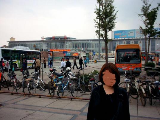 【夜】 夕食は名物<青島ビール飲み放題付き海鮮料理>。------------------------------細かなところで当初の予定が大幅に変更になっています。シ博観光を終えて専用バスで移動でしたが、急遽、中国版新幹線「子弾頭」で青島へ。シ博駅前にて。本人の許可がないので、顔を塗っています。出発予定時間まで1時間ほどあったので、またまた添乗員さんの計らいで30分の自由時間をいただきました。駅周辺はそれなりに活気があり、デパートも散在していました。大型デパートらしきビルの1階には、贋物のブランド靴が普通に売られてます。何よりも驚いたのは携帯電話の多さ。中国はプリペイド式が一般なので何百種類もの新・中古問わず、陳列されていました。こちらは待合所。新幹線といえども在来線と一緒の路線を走っています。待合所で待っていると急に、路線事故のアナウンス。添乗員さんが本社に連絡し、その後の方針を決めるためにツアー客のそれぞれの代表が集まり、一路、青島へ向かった専用バスを呼び戻すかこのまま待合所で復旧を待つのか、の、話し合いになりました。1人の70歳ぐらいの男性「日本だって事故による復旧は半日かかるんだから バスを呼んで青島へ向かおう」1人の65歳ぐらいの男性「(出発時間が随時表記されている電光掲示板を見ながら) 徐々にだけど復旧されつつあるんだから待つべきでは? それに中国の新幹線も乗りたいことだし、記念にもなるでしょう」65歳男性の意見が受け入れられそうになった途端・・70歳男性が突然怒りだし、「俺はバスで向かう! いつ復旧の見込みもないものを待つやつらは 規定の帰国時間にも間に合わずにここに足止め食らってろ!」と言う始末。この言葉に、自分も含めてそれぞれ意見を出せずにしばし無言。このやりとりを受けて、添乗員さんがバスの運転手に連絡を入れつつ、予定時間の切符を一番早く乗れる便へと何度も往復してくれていました。結局、1時間半で復旧し、へそを曲げた70歳男性も何もなかったように添乗員さんを褒めてました。本来の予定としては、青島に夜7時に到着し、そのまま晩御飯を食べ、8時半には自由行動になるのでジャスコでお土産等の買出しに行きたかった。ほかのツアー客もそれを楽しみにしていました。それが9時到着。10時過ぎまで飲み放題食べ放題。飲み残したものまで持ち帰り自由。そんな特典もまた何が起こるかわからない、旅の良さでしょうね。