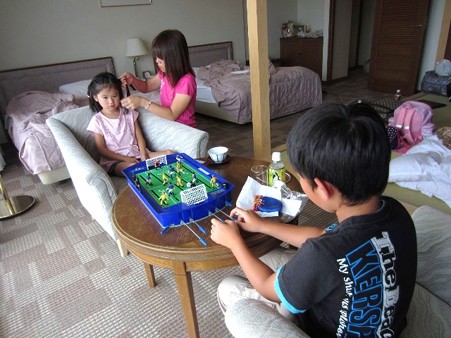 温泉を楽しみにして・・マッサージをお願いしておいたつもりの私たち親子だったが・・残念なことに・・・ 富士見園 には温泉は無く・・海水を沸かしたお風呂で・・大浴場という風呂場は・・・私の町でいう・・家族風呂のサイズ おまけに・・マッサージをお願いできる部屋として予約してもらった特別室には・・最新かと思われるマッサージ機が鎮座していたのだった・・ でも・・・でもねぇ・・・これらは・・誇大広告だったリ・・騙された感じじゃないのよねぇ 田舎の・・ 私の町も・・充分に田舎だけど・・ 田舎モンの私から見ても田舎に見える・・感じると言う意味です 人が良さそうで・・働きものの人たちが経営したり・従事したりしている旅館としては・・普通の・・当然のものだったのだと思えます その根拠は・・・別館に移動しての食事・・・料理旅館の名に恥じないもので・・ 個室には・・焼き方の人もついての・・伊勢海老を真ん中にしたお造りから・・アワビの踊り焼き・・煮魚に・・揚げ魚・・伊予牛に・・鯛の釜めし・・・ 愛媛 130 posted by (C)takatobaabaそれはそれは・・親切で・・・美味しいもの満杯でしたからねぇ この夜は・・・私たちの部屋に泊まった うーちゃん と 倖 の関係に・・ takato も加わりどこで覚えてきたのか・・・枕投げで大盛り上がり 枕投げの後で posted by (C)takatobaaba私は・・この富士見園のHPにも出てくる・・下駄の履き心地が気に入り・・女性陣へのおみやげに同じものを注文してきました~ ふふっ・・ 5足注文してきたけど・・ 家に帰ってきたら・・足らないことが判明し・・ 追加注文までねぇ・・ 届くのが楽しみです お昼寝も無く・・疲れ切って・・ご機嫌斜めになっちゃった桜火クンの泣き顔・・可愛かったから・・・上のスライドショーに載せちゃいました~
