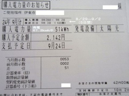 自己中で・・水不足が深刻な地域の方には申し訳ない話題ですが・・・9月に入ってからも・・抜けるような青空が毎日続いている事に・・我が家としては・・さい先が良いと喜んでいます。月初めに・・電気使用量の検針があったのだが・・検針票の書式が・・我が家の状況に追いついてなかったため・・買電と売電・・それぞれの検針票が郵送で送られてきた。ジャンッ!!記念すべき・・・初めての売電・・金額が出ました~ 初 売電 posted by (C)takatobaaba 8/28に・・メーター等の機器は接続はしたが・・ ソーラーパネルの実質稼働は・・8/29 の・・・午前10時頃から。 正味5日間で・・・51kwh 金額にして・・・2,142円です こんな風に・・・ 002 posted by (C)takatobaaba 発電・消費・売電 (3) posted by (C)takatobaaba瞬間的な数値も・・リアルタイムで見れるので・・・節電への励みにもなります ちなみに・・・これ ↓ が・・昨日までの・・発電ベスト5・・ 発電・消費・売電 posted by (C)takatobaaba 9月に入ってからの・・・発電と消費 発電・消費・売電 (4) posted by (C)takatobaaba売電と買電 発電・消費・売電 (5) posted by (C)takatobaaba昨日(9/12)一日の発電と消費量 発電・消費・売電 (7) posted by (C)takatobaaba同じく・・・昨日(9/12)一日の売電と買電量 発電・消費・売電 (6) posted by (C)takatobaabaまだ・・日に何度もチェックしたくなるほどの興味を持ち続けています