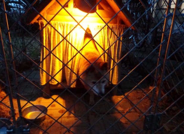 こんばんは。柴犬さくです。さくらさんに「夕方散歩ですよ。」と声を何度かけても起きません。小屋の中で爆睡でした。それとも少し耳が遠くなったかな。