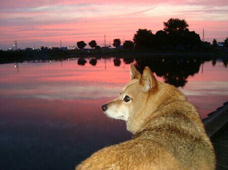 こんばんは。柴犬さくらです。 夕焼けに染まる出羽公園の池の様子です。