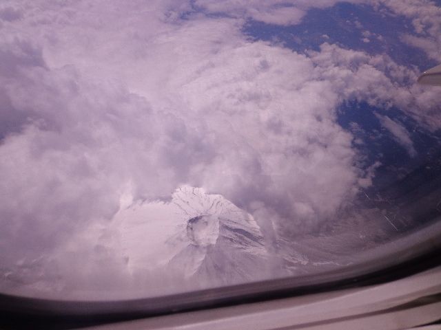 窓から下を見ると、丁度富士山上空で山頂が見えました。