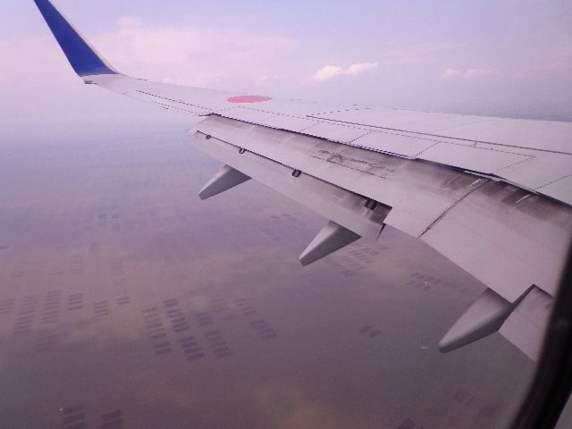 さあ、そろそろ佐賀空港が近づいてきました。高度を落とし、海上に牡蠣の養殖場が見えます。