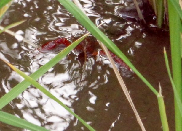 田圃の中でアメリカザリガニが犬影で驚いてこの後両ハサミを振り上げましたよ。