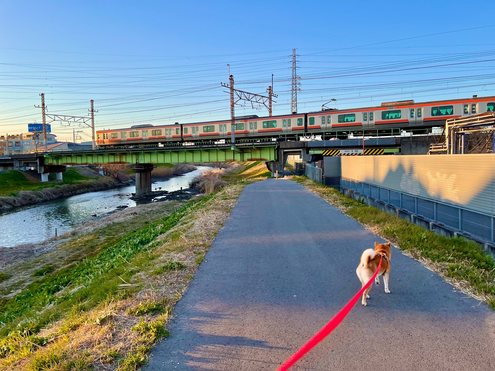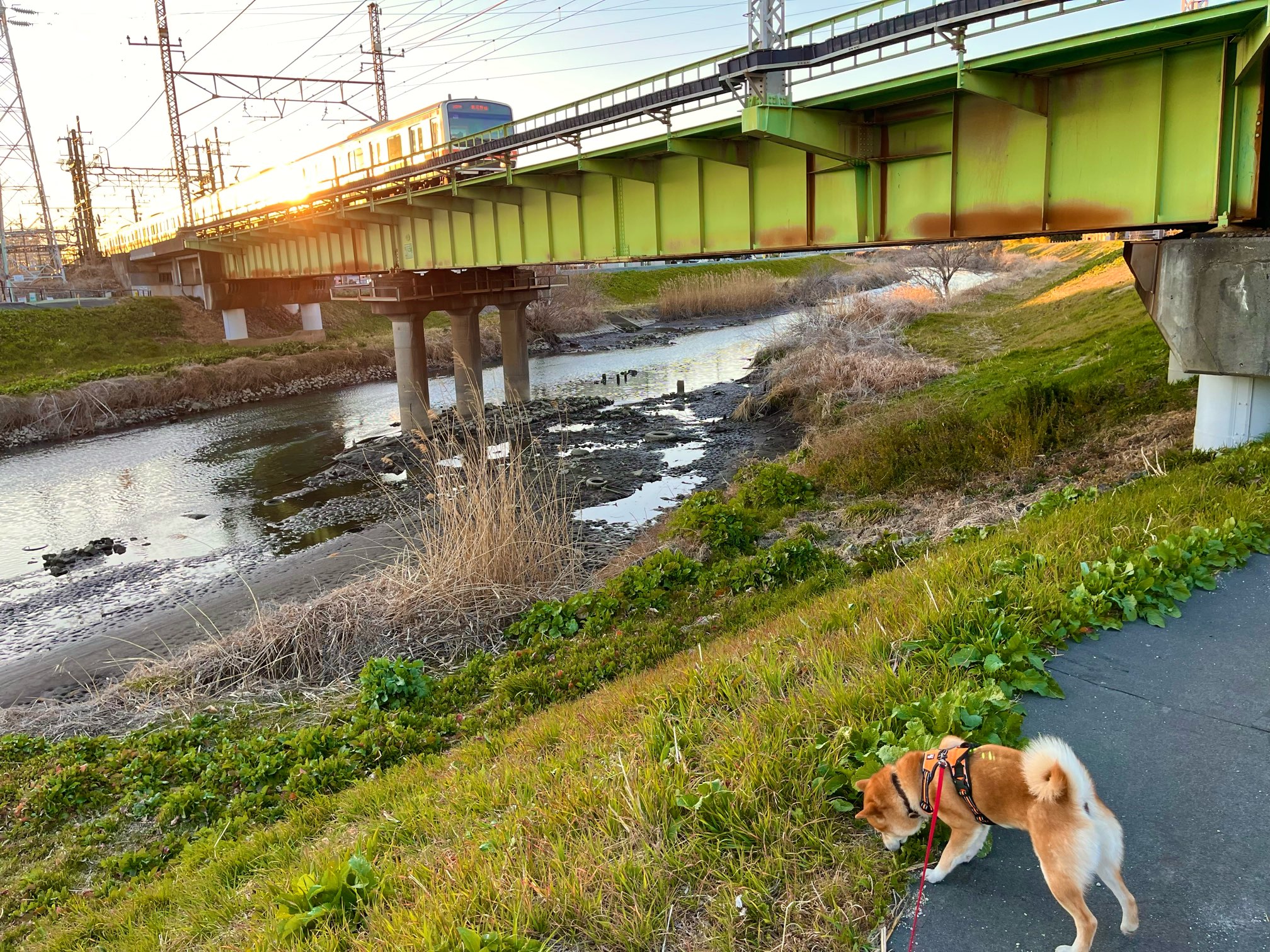 綾瀬川の夕方散歩です。武蔵野線のガードと遊歩道の交差地点です。遊歩道もアスファルトになって助かります。以前は、雑草が生い茂って夏場は、歩くこともできませんでした。