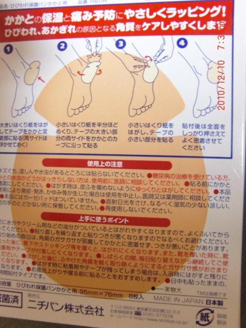 冬になるとかかとがカサカサして固くなるけど、靴下をはいていてかかとは見えないし、素足になることはないから「まっいっかー」で過ごしてきた。でもやっぱ気になるかかとがカサカサだとストッキングやタイツにひっかかるし、やけにオバサン化したような気になる。ニチバン株式会社の「ひびわれ保護バンかかと用8枚入り」 そんな時に見かけたこの商品のモニターに応募したら当選 箱を見たら・24時間いつでもどこでもかかと保湿が可能! という触れ込み。フムフム・・・ 早速試してみましたよ 上記の図のようにかかとをラッピング貼ってる事を忘れてるぐらい違和感ナシでした。うっかり忘れていた私は24時間以上貼りっぱなしだったもん8枚しか入っていないからカサカサが治るまでにはリピートする必要がありそうだけど、いいものを試すことができました。 貼っておくだけなので軽石でこすったり、クリームを塗る手間もなく簡単でいいかも ひびわれ・あかぎれの原因となる角質をケア!ニチバン ひびわれ保護バン かかと用 8枚入り価格:460円(税込、送料別)