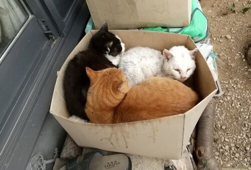 22日は風が強めで時々雲が流れても、日差しは暖かかったさいたまです 2月22日、猫の日でしたね にゃん月にゃんにゃん日、今月のニャンズの様子です。 ↑ 庭の常連野良ニャンズは、相変わらず仲良く箱入りしています 2月の初めに当地も積雪がありましたが、野良ニャンズは屋根下の段ボールの中で箱入りして暖をとって過ごしました ↑ 茶ロング君は縄張りの見回りをしたり、ナデナデされに出て来てくれるので、 ↑ 小柄なオジマさんと白黒姐さんの上に乗っかっている事が多いです(笑)。 でも冬毛と皮下脂肪でポヨポヨな茶ロング君は暖かい掛け布団です。 ↑ 家ニャンズは窓際で仲良く日向ぼっこしたり、 ↑ 毛布の上や、赤いちゃんちゃんこの中で猫団子しています ↑ 節分では今年もクツシタちゃんにお面をつけてもらいました(豆は投げつけていません) ↑ ついでに、最近飲んだもの 駅の自販機で買った一風堂のラーメンスープ。 持ち帰るまでに冷めてしまったので、グレー子姉ちゃんのお腹の下で温めてもらいました。 缶のコーンスープなどのように、普通に缶スープとして楽しめますね。 寒い季節の小腹満たしにも良さそう。美味しかったです 去年から無料小説サイトのカクヨムで投稿を始め、天西照実という筆名で活動しています 最近は、高校生たちの『トイレットミステリー』 怪談に登場する幽霊の本音『幽霊による怪談会』 2月2日は私の誕生日だったので、誕生日にまつわる超短編『魔女の誕生日』というお話も投稿しました。 庭ではクリスマスローズも咲き始めて、そろそろ畑仕事も再開したいです