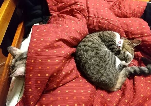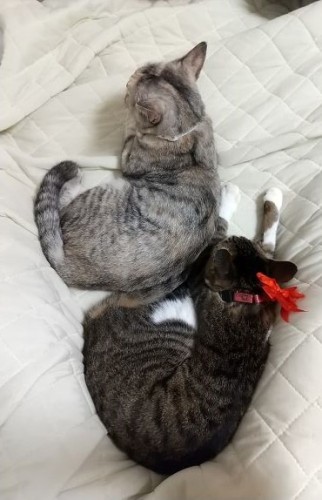 5日は雲に覆われ、時々雨がパラついたさいたまです ↑ パソコン作業をしていると、2ニャンが膝の上に乗ってくる季節になりました 暖かいですが、やっぱり2匹だと重いですね(笑)。 ↑ お布団の上でも、くっつきっこ ↑ やっぱりクツシタちゃんはこっち側が良い~ ニャンズお気に入りの赤いちゃんちゃんこも干してありますが、出して置くのを忘れました。 急に涼しくなって、ぬくぬくニャンズの写真もたくさん撮れる季節になりました