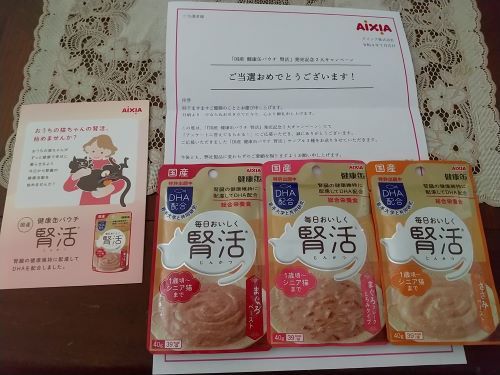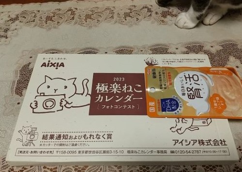 22日は日差しの見える時間はあっても雲が多く、夜には雨がパラついたさいたまです 9月にゃんにゃん日、極楽ねこカレンダーフォトコンテストの参加賞をいただきました。 ↑ 今年も、極楽ねこカレンダーフォトコンテストの参加賞が届きました(月初め頃に)。 キャットフードのアイシア主催。 毎年、下手な写真で応募させてもらっていますが、落選しても参加賞がいただけるのも魅力です。 入選写真はカレンダーに載せてもらえます。 ↑ 今年の参加賞はパッケージもキレイです 細かいカラフル折り紙がボール紙にちりばめられています。 ↑ 参加賞はアイシアのレトルトパウチ3種 クツシタちゃんがアピールしていますが、お味見はまた今度ゆっくり~ ↑ 応募したのは、まんまるクツシタちゃんの写真 ニャンズが可愛いタイミングはたくさんありますが、それを写真におさめられる事ってほとんどありません。 もっと上手に撮れるようになってみたいものですが、なかなか難しいですね でも、可愛い写真を狙うのは楽しいです。 アイシアさん、今年もありがとうございます