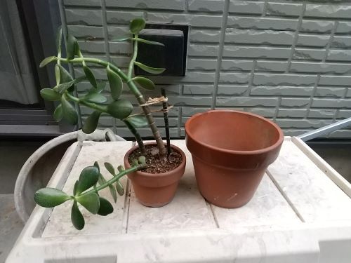 19日は台風14号の影響で、日差しが出たり急な暴風雨もあったさいたまです 『最強台風14号』なんて表現されていましたが、あちこちで被害が出ていますね。 当地では雷が聞こえたり、急に日差しが出たと思ったら暴風になったり なるべく被害は少なく行き過ぎて欲しいものですね。 ↑ 植木鉢が小さい&夏の暑さでグッタリしているカネノナルキ 2016年の夏ごろに母の実家から茎をポキッと折ってきて挿し木し、何度かお腐れになりかけながらも2020年秋にも鉢上げ移植していました。また育ったので涼しくなったら鉢上げしようと思っていました。 今回は二回りほど大きい鉢に。 ↑ 以前と同じような土を使いました。 鉢底用の軽石より、硬いひゅうが土の方がいくらか保水保肥力があるし崩れにくいので、鉢底石に使っています。 ↑ 根鉢が絡んでいなかったので、3本伸びているのをこんな感じで移植しました。 ふた鉢に分けておけば、何かあっても同時に枯れてしまう事は無いんじゃないかな~ ↑ しっかり根が張るまで、枝で松葉杖のように支えておきました。 手ごろな支柱が無かったので、硬いスモモの枝を使いました。 ↑ 新芽も見えているので、なんとか元気に復活してほしいです 肉厚な葉のカネノナルキは寒さにも弱いですが、高温多湿でもお腐れになりやすいですね。 発根も促してくれるメネデールを入れた水をたっぷりあげておきました。メネデール 植物活性素 500mL 関東当日便日向土 大粒(5L)【お試し】 カネノナルキ(花月:カゲツ) 白色 プラスチック鉢 4号 桜花月 カネノナルキ 金のなる木 カゲツ ベンケイソウ 多肉植物 多肉質 多肉 鉢植え 苗 苗木 観葉植物 カランコエ フチベニベンケイ 縁紅弁慶 成金草 本日の家ニャンズ ↑ 薄暗い廊下から、じーっと何かをアピールする家ニャンズ おやつの時間はまだですよ~~